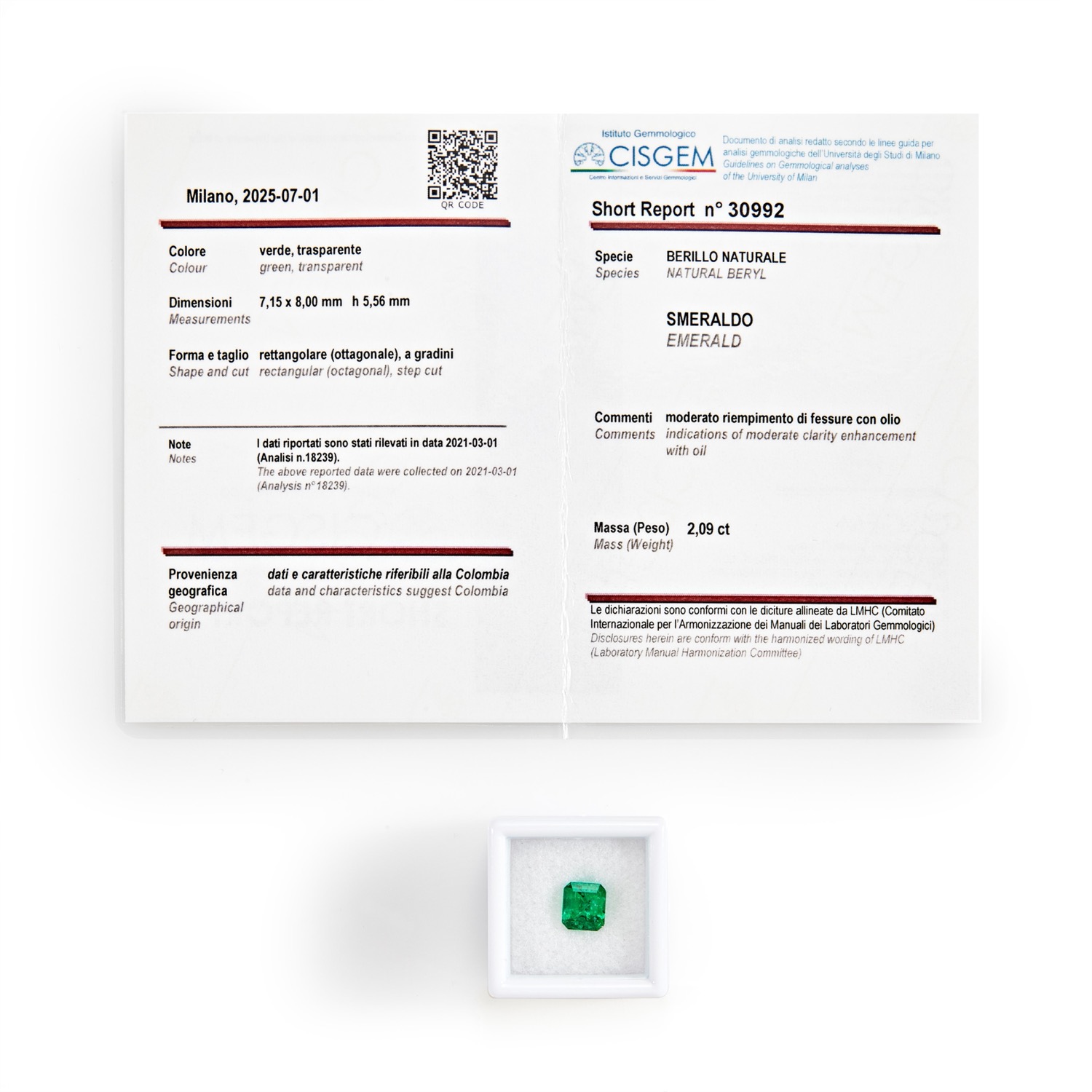 Smeraldo Colombia in cartina ct 2,09 mm 7,15x8,00 h mm 5,56