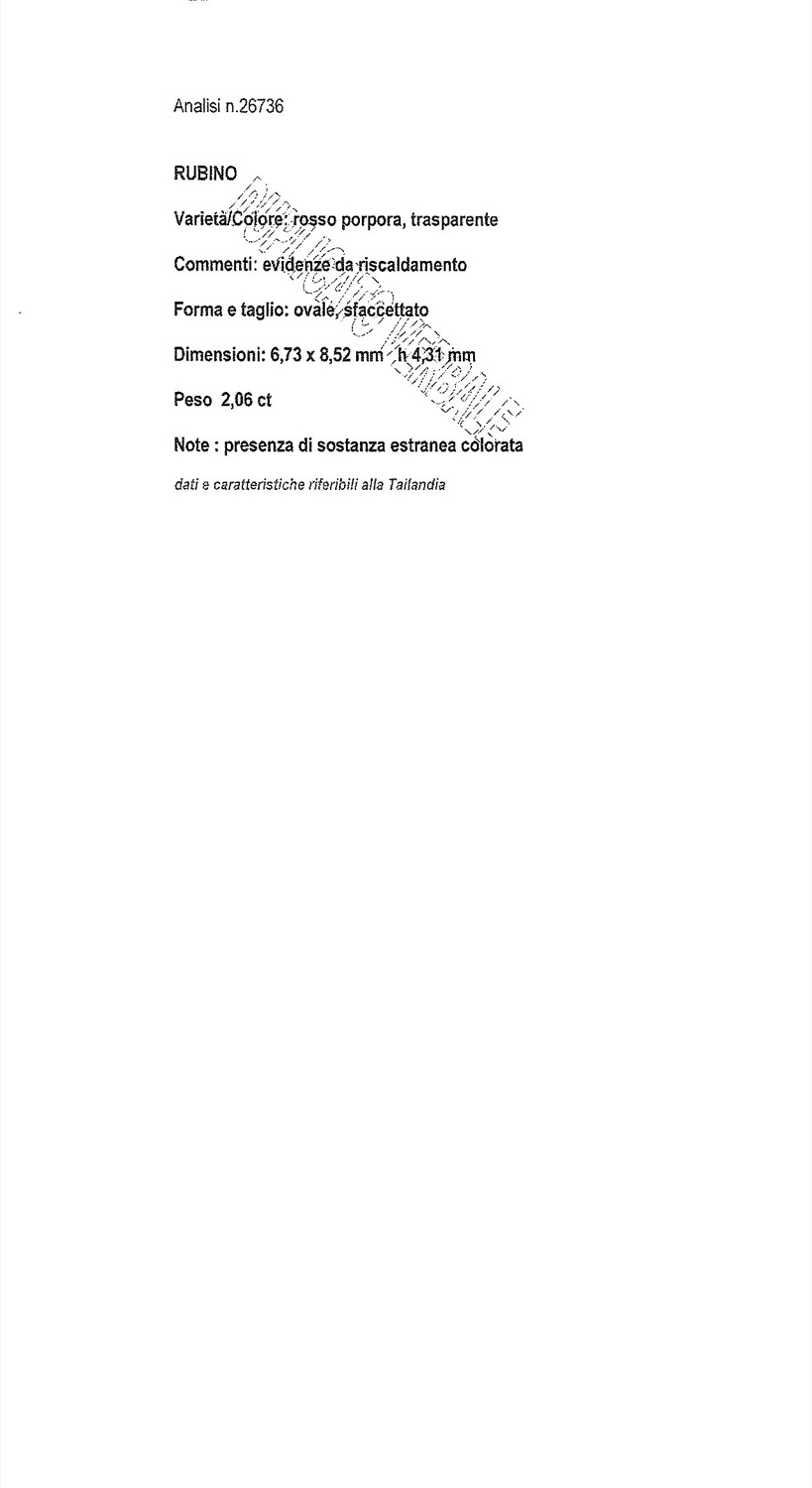 di forma ovale, taglio sfaccettato, heat, presenza sostanza estranea colorata, difetti (fenditure).