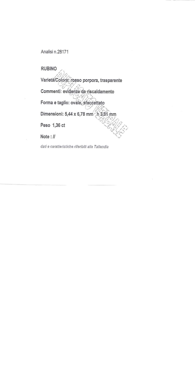 Previous Lot 181 Next Finarte - Via dei Bossi 2, 20121 Milano Gemme / Tutti i colori della natura Sessione unica Tuesday 23 September 2025 hours 11:00 (UTC +01:00) Rubino Tailandia in cartina ct 1,36 mm 5,44 x 6,78 h mm 3,81 di forma ovale taglio sfaccettato, heat.
