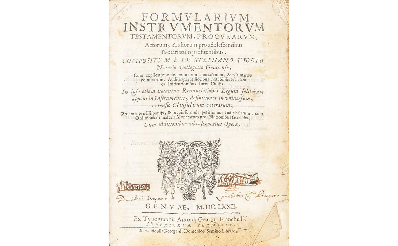 C) Viceti Gio. Stefano Formularium instrumentorum Genova Ex typographia Antonii Georgii Franchelli 1672.