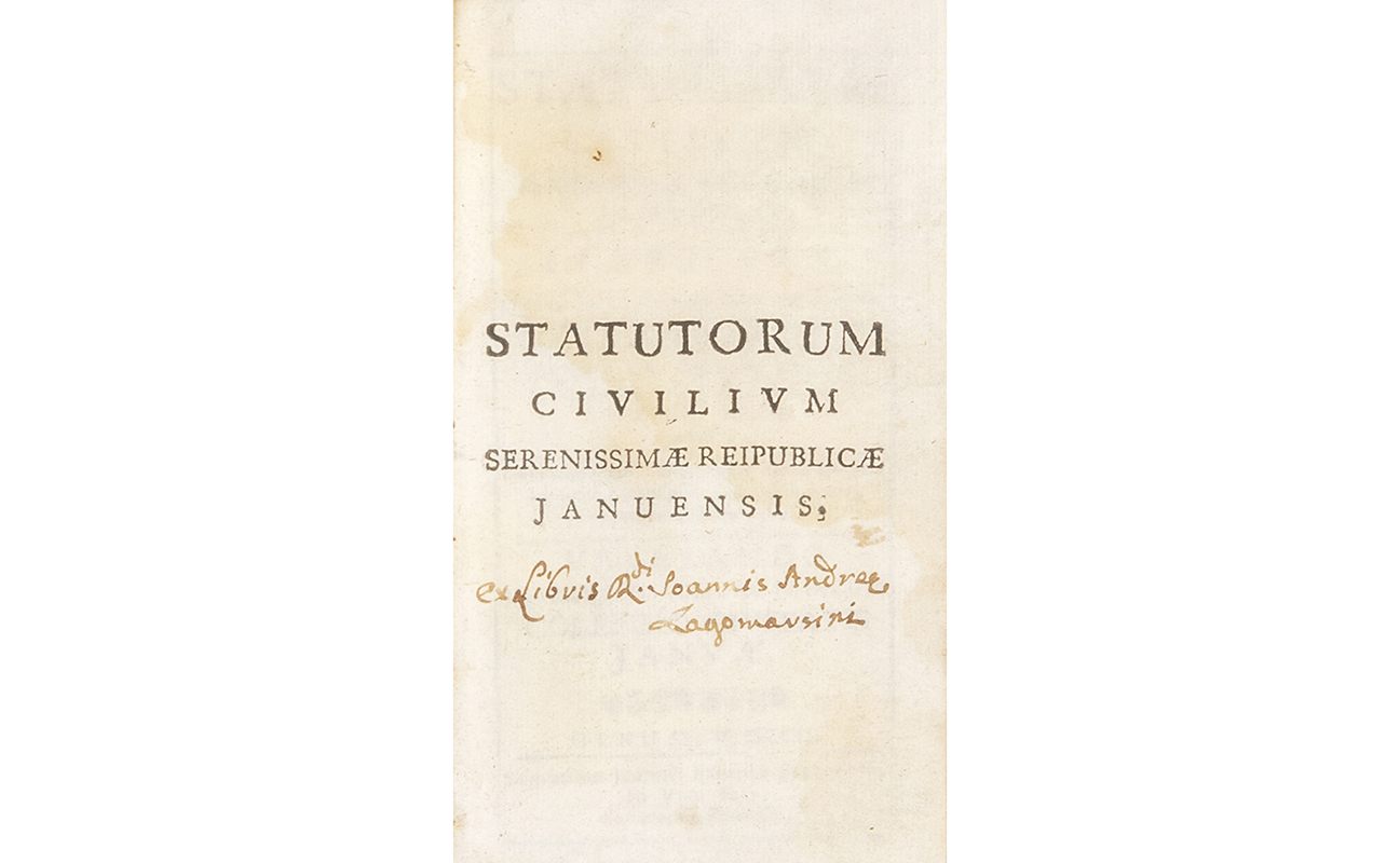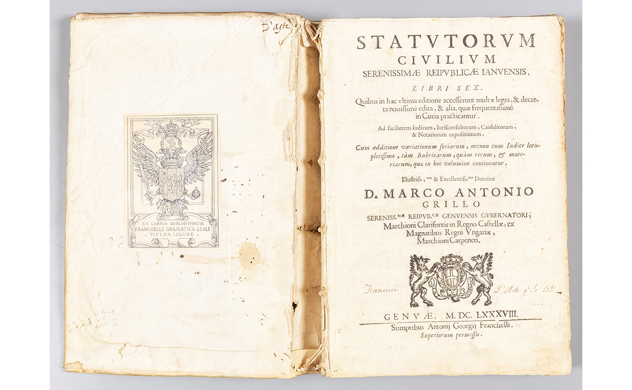 A) Statutorum civilium serenissimae Reipublicae Ianuensis libri sex Genova Sumptibus Antonii Georgii Franchelli 1688.