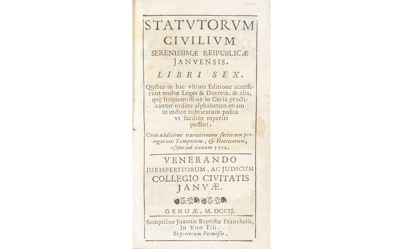 B) Statutorum civilium serenissimae Reipublicae Ianuensis libri sex Genova Sumptibus Antonii Georgii Franchelli 1702.