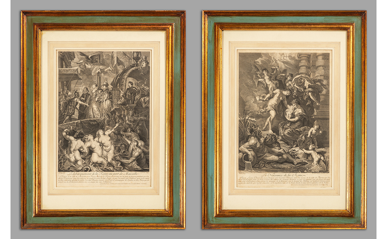'Lo sbarco della Regina nel porto di Marsiglia' e 'La nascita della Regina' coppia di stampe da Rubens G.Ducange sculpsit sec.XVIII