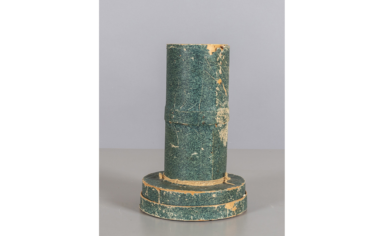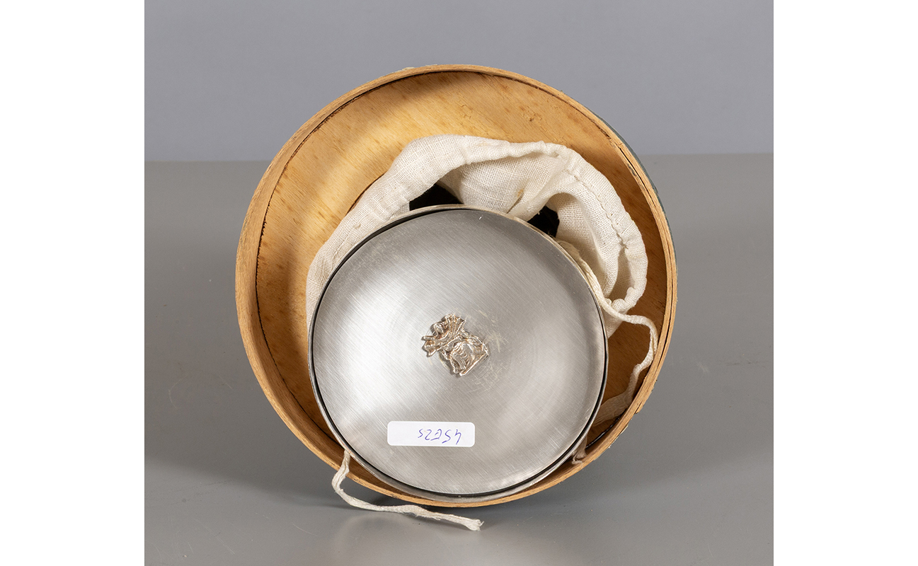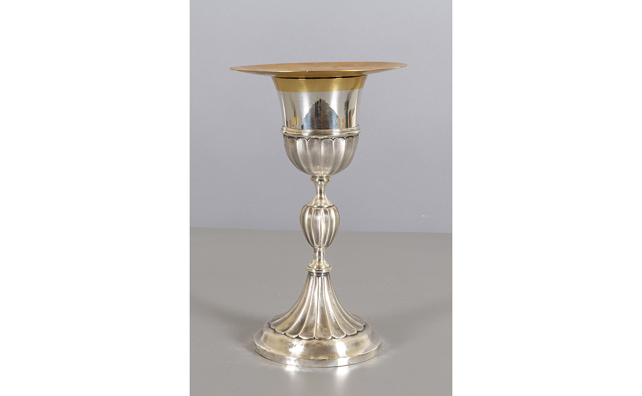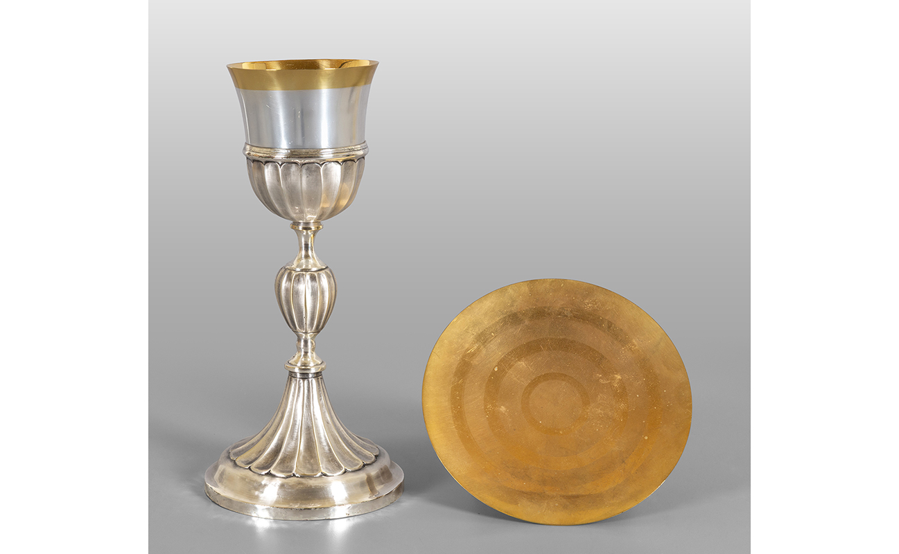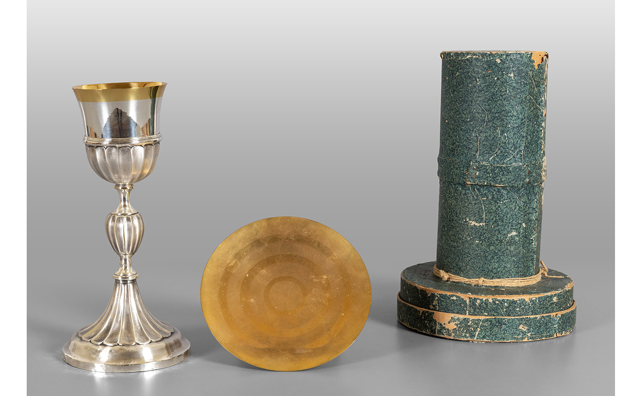 Calice in metallo argentato con coppa in argento vermeille e patena scatola originale sec.XIX