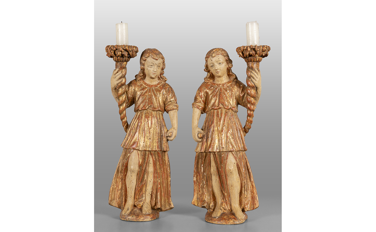 Coppia di angeli portacero in legno intagliato e dorato Toscana sec.XVII