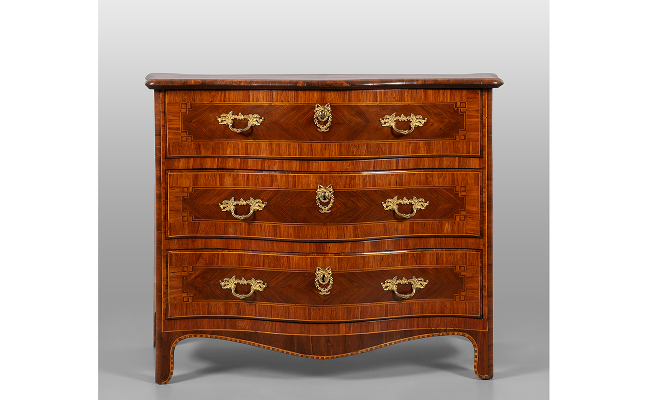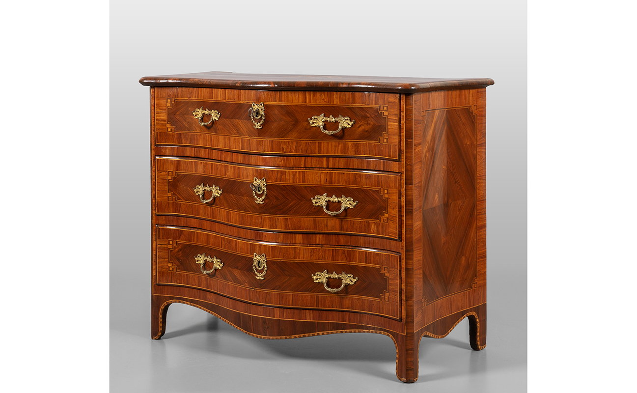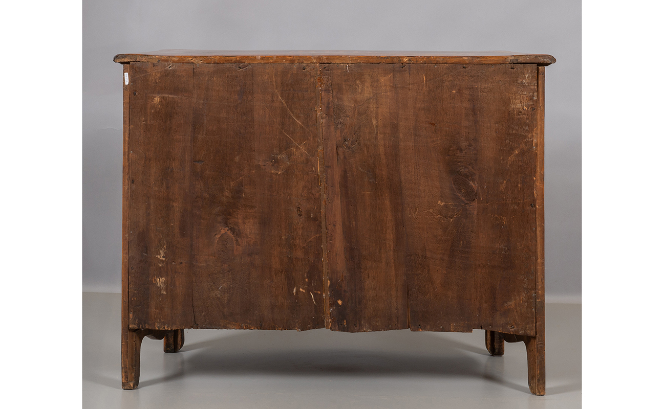 Cassettone Luigi XIV movimentato sul fronte e sui fianchi lastronato in palissandro e filettato in legni di frutto Piemonte I metà sec. XVIII