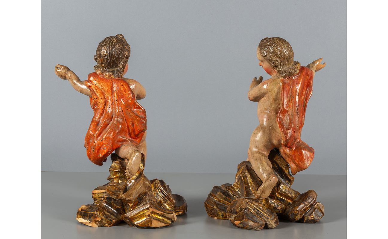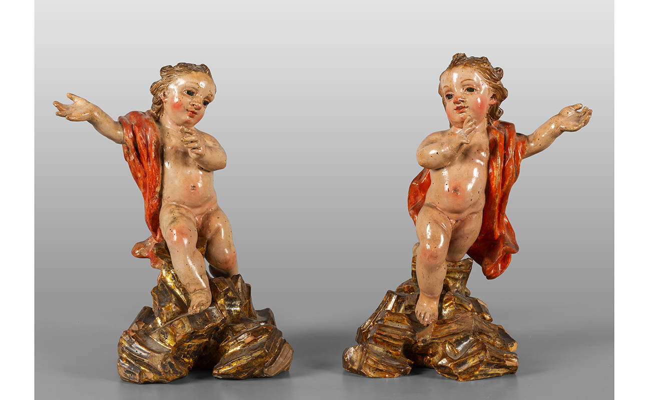 Coppia di putti in legno intagliato e policromato occhi in vetro poggianti su basi a roccaille in legno policromo Italia Meridionale sec.XVIII