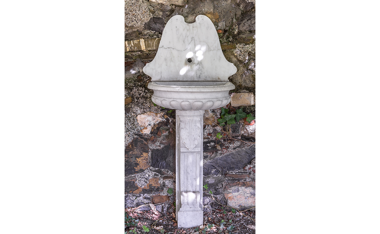 Fontana da muro in marmo bianco montante scolpito sostiene una vasca bacellata parte superiore movimentata sec.XIX