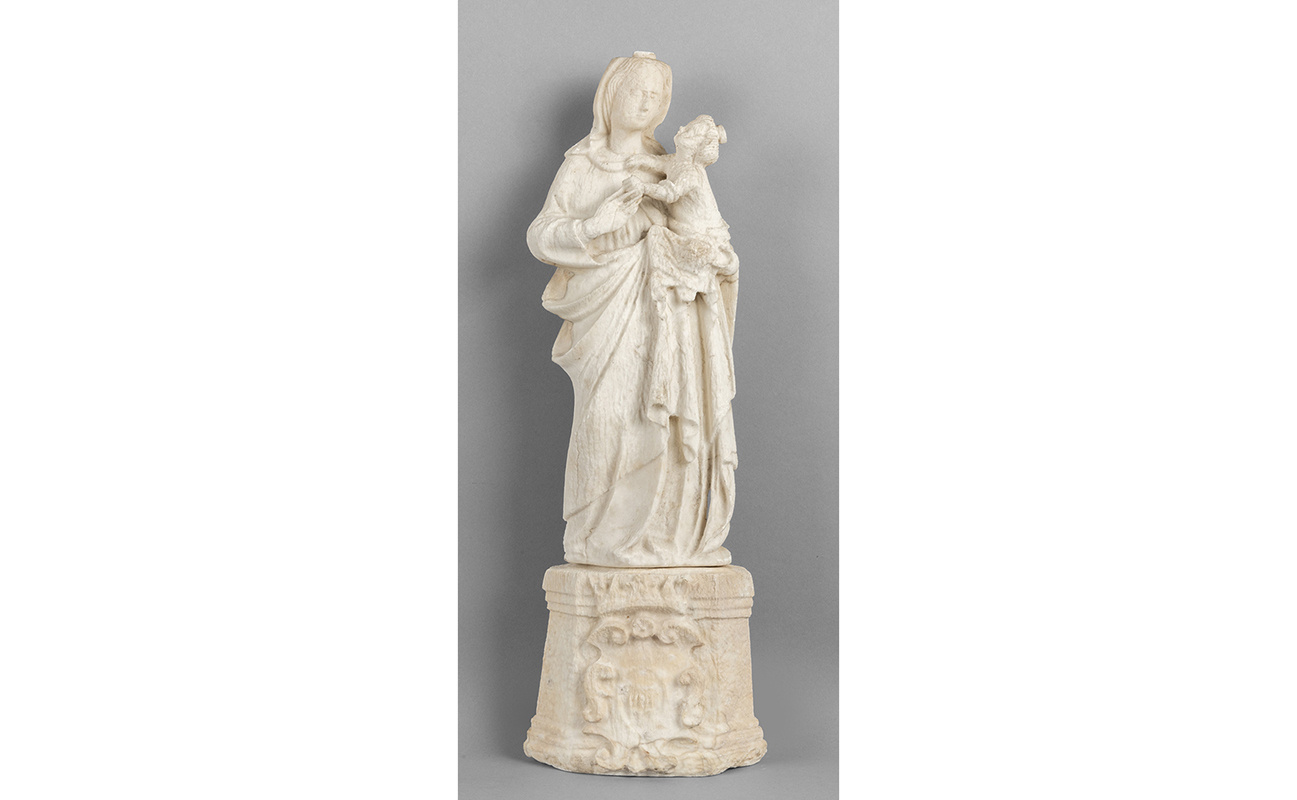 Madonna con Bambino antica scultura in alabastro con base consumi e mancanze