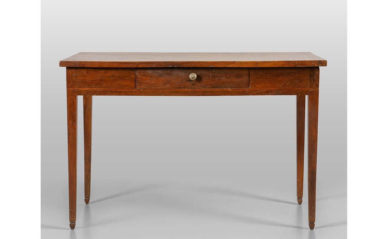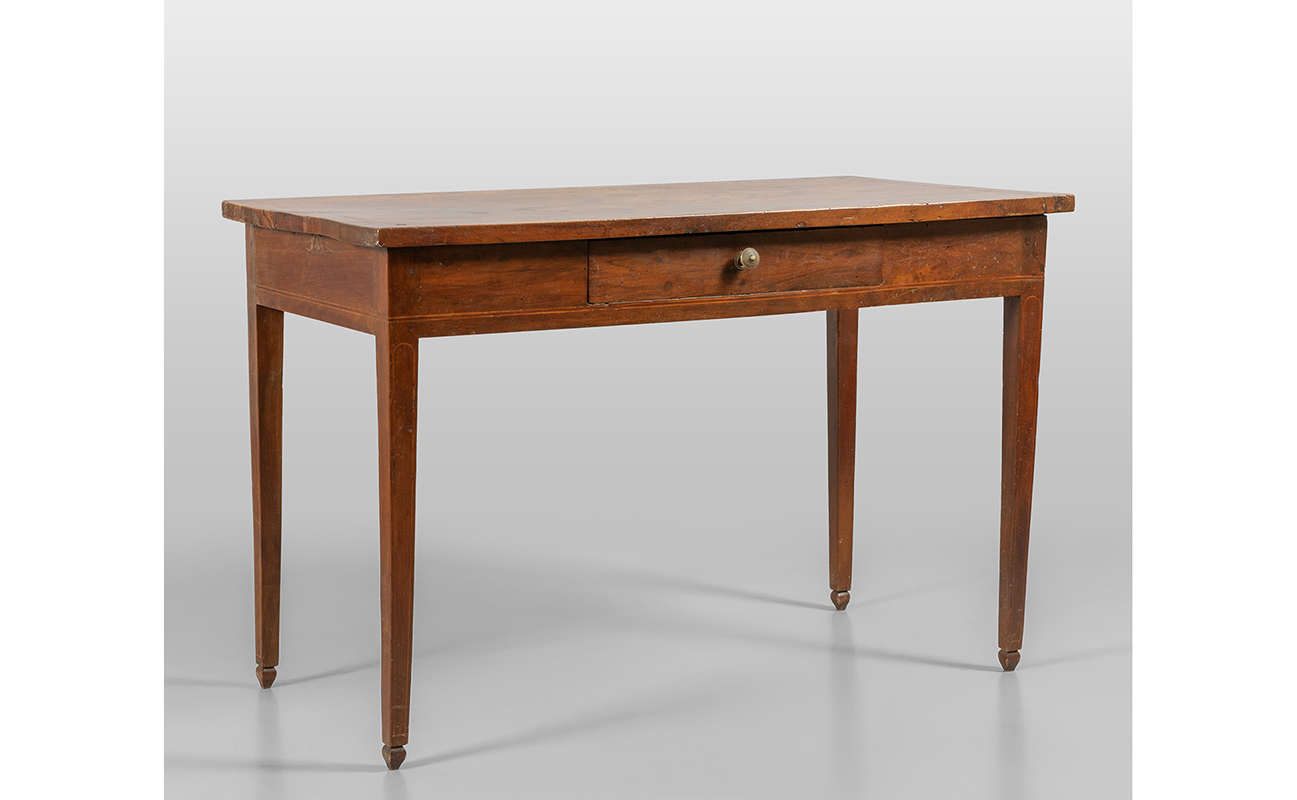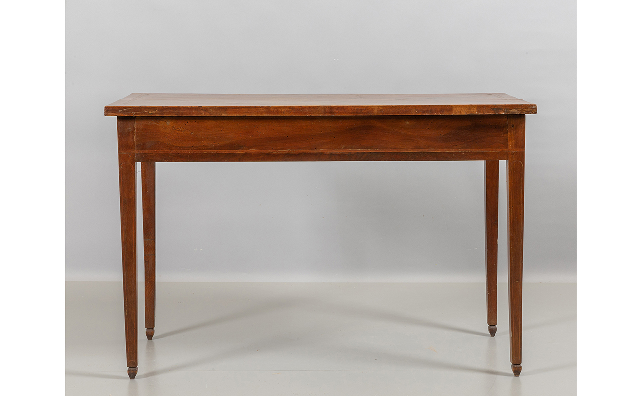 Tavolo Direttorio da centro in noce intarsiato in legni di frutto un cassetto nella fascia sec.XIX