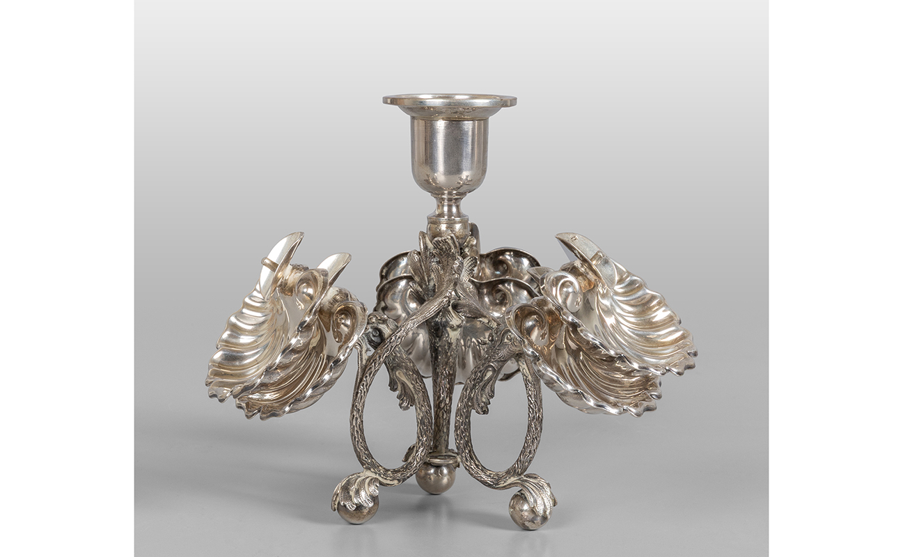 Previous Lot 1100 Next Aste Boetto - Via Mura dello Zerbino 10R, 16122 Genova ASTA DI ANTIQUARIATO ASTA DI ANTIQUARIATO Thursday 2 October 2025 hours 15:00 (UTC +01:00) OGGETTISTICA Candeliere in argento sbalzato con sei portacenerih.cm.14 gr.380