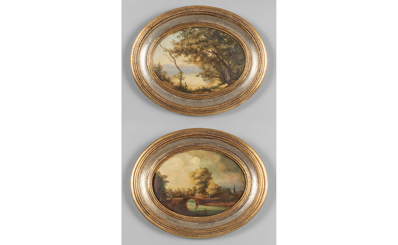 Scuola italiana sec.XIX 'Paesaggi' coppia di olii su metallo di forma ovale