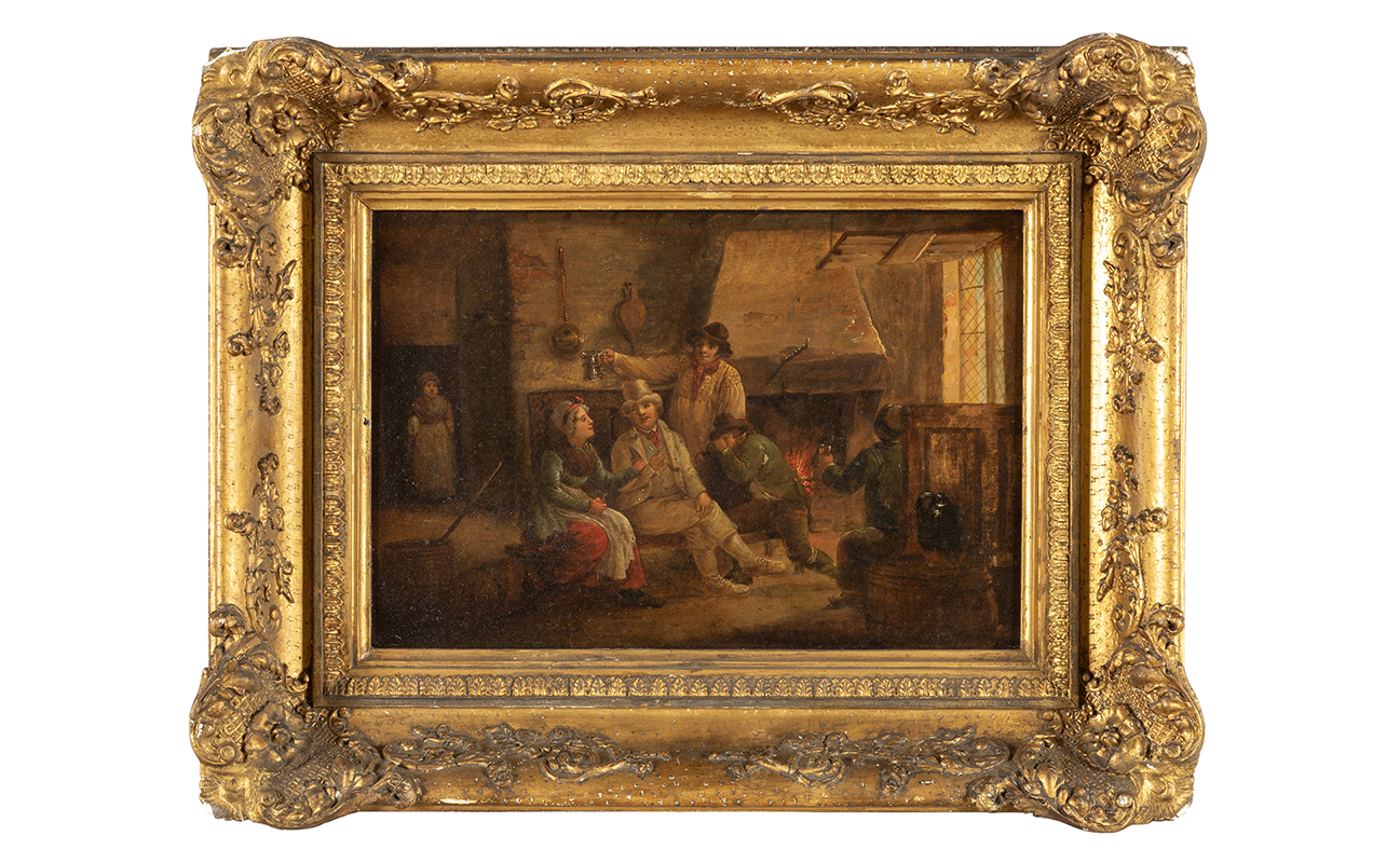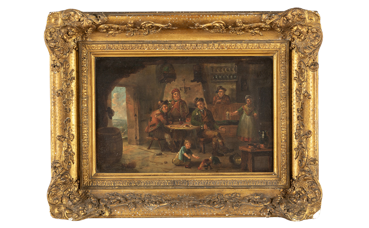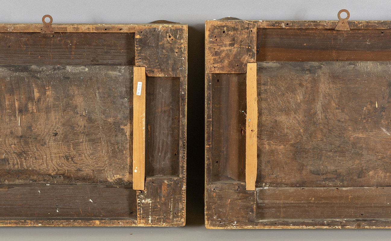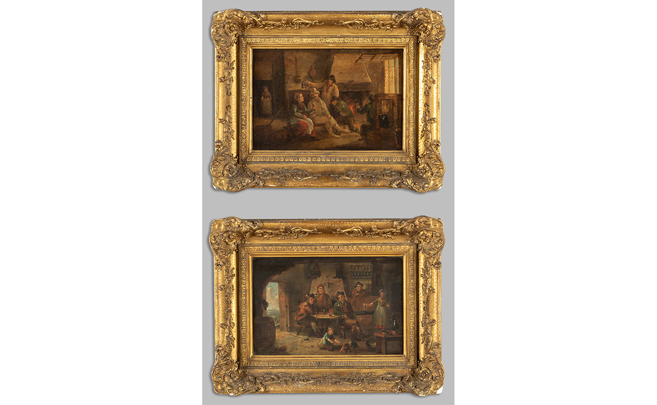 Scuola fiamminga sec.XIX 'Interni animati da molte figure' coppia di olii su tavoletta