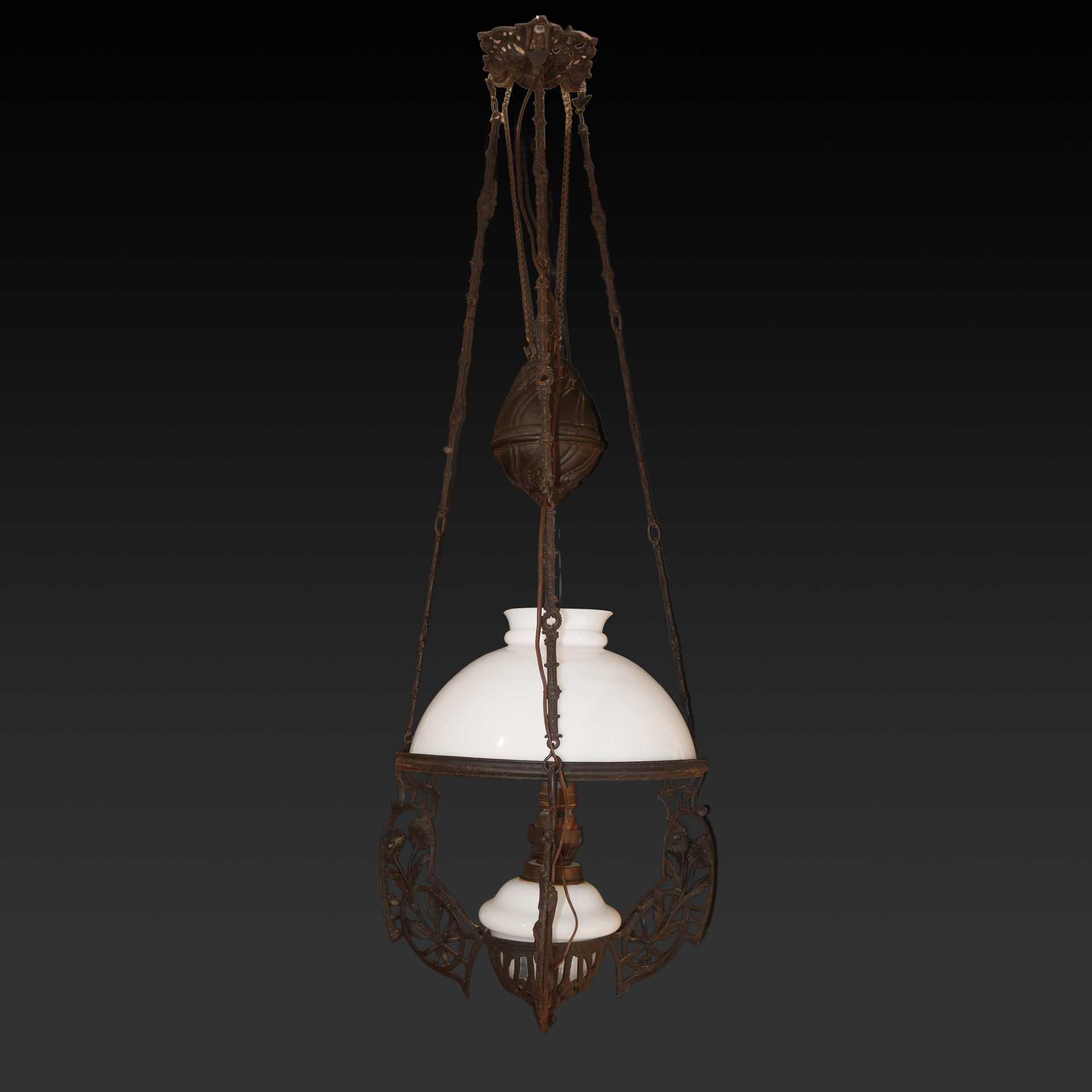 Lampadario sali e scendi in opaline bianca con serbatoio a petrolio