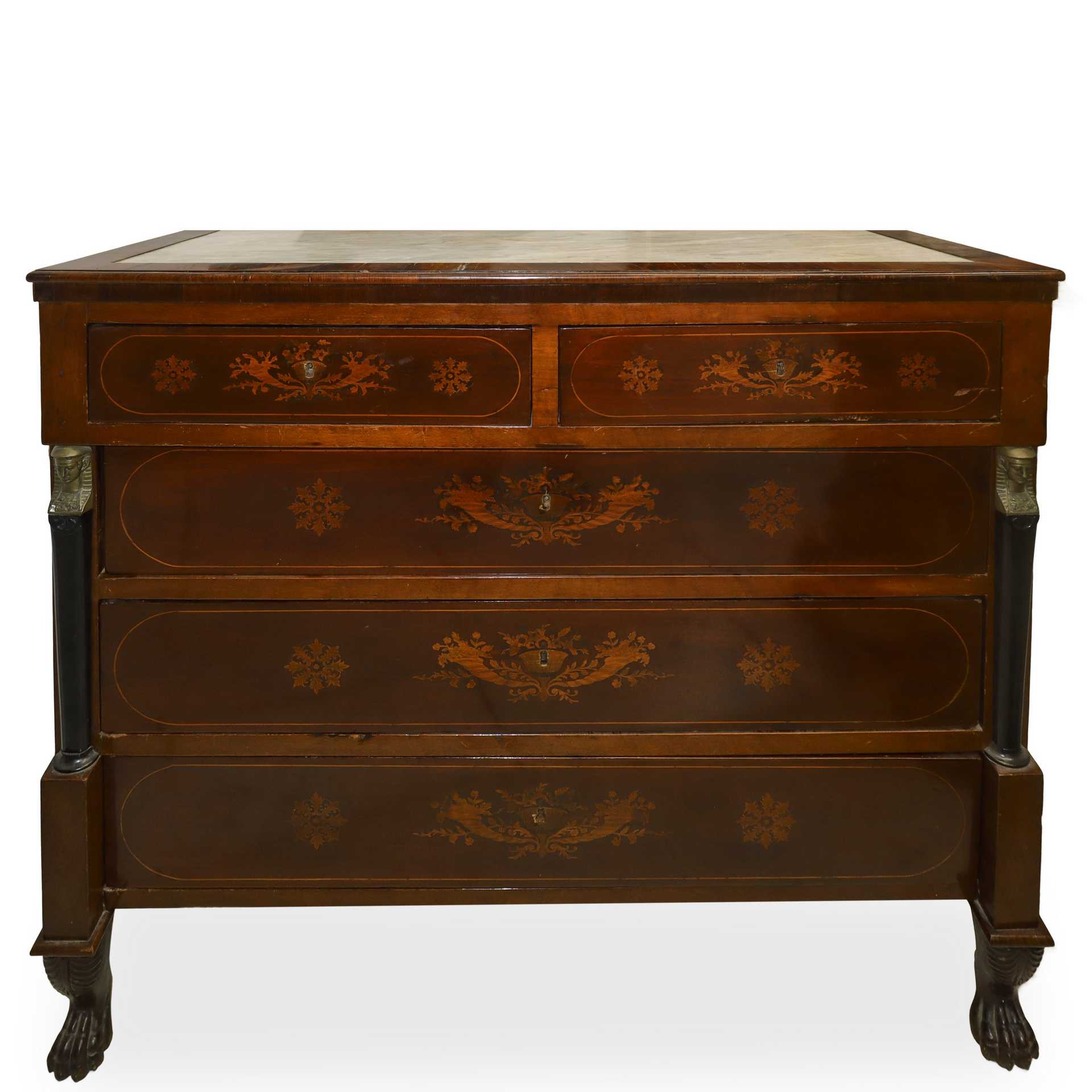Cassettone in legno di mogano , Second Empire 19° secolo h cm 112X124,5X56 Due casetti sottopiano più tre con colonne ebanizzate nere con capitelli egiziani con intarsi sul fronte in legni chiari, marmo bianco incassato al piano