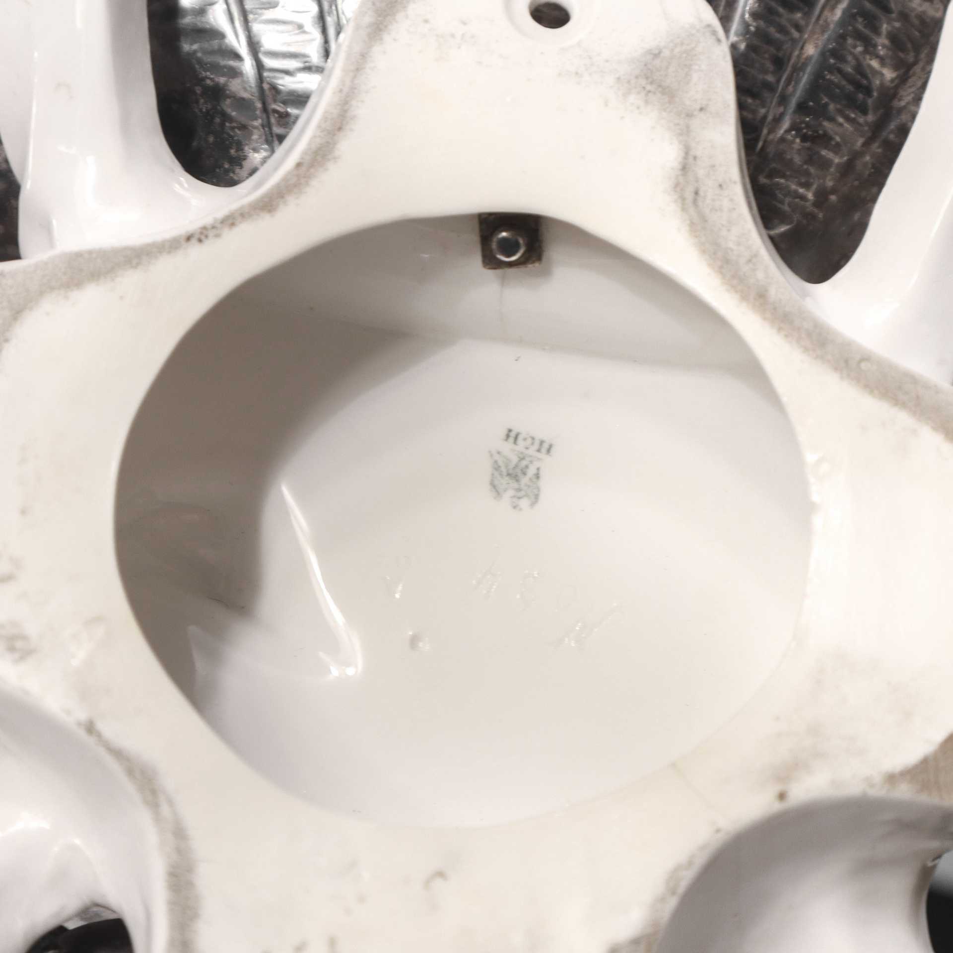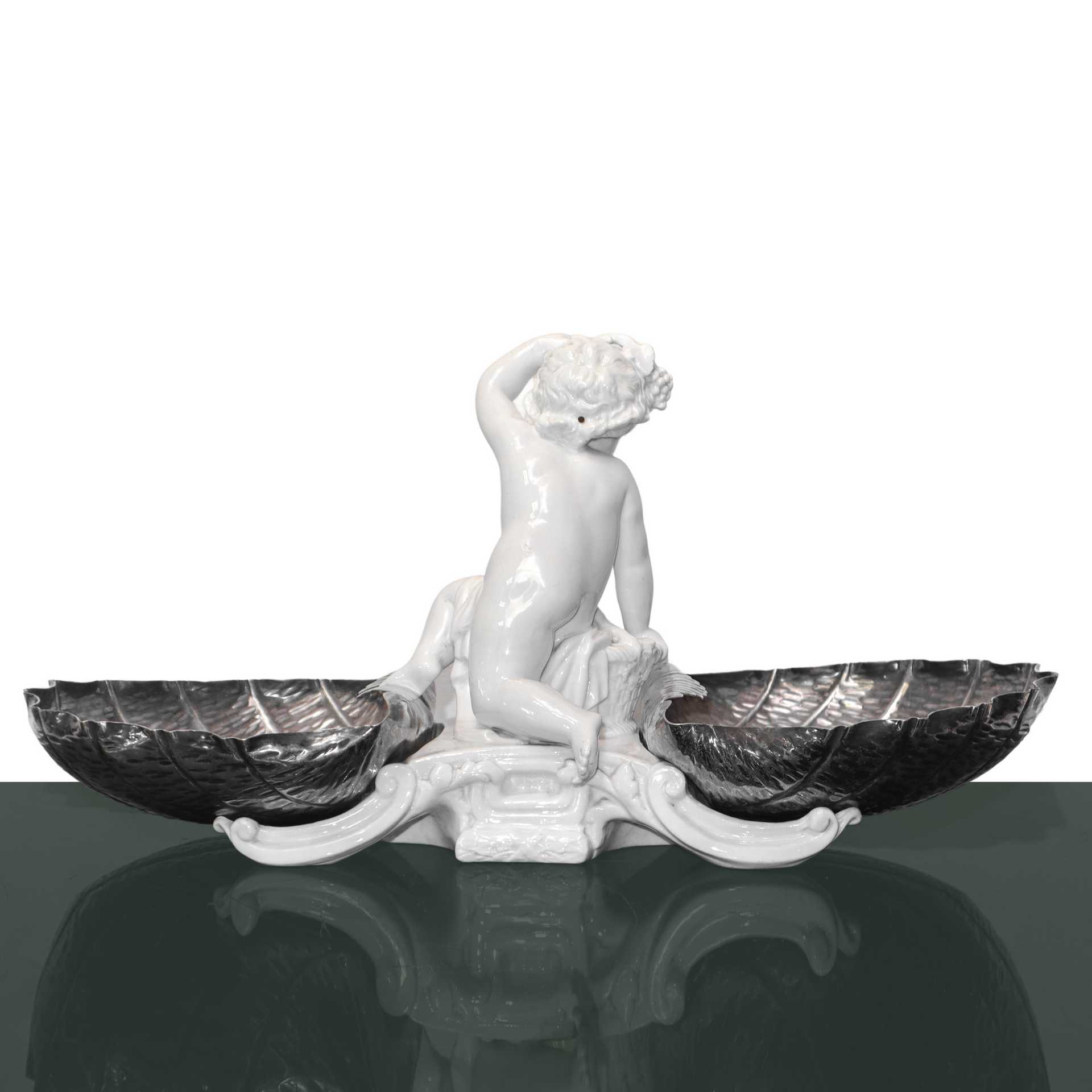 Alzata con putto in porcellana bianca e piatti a guisa di conchiglie in sheffield