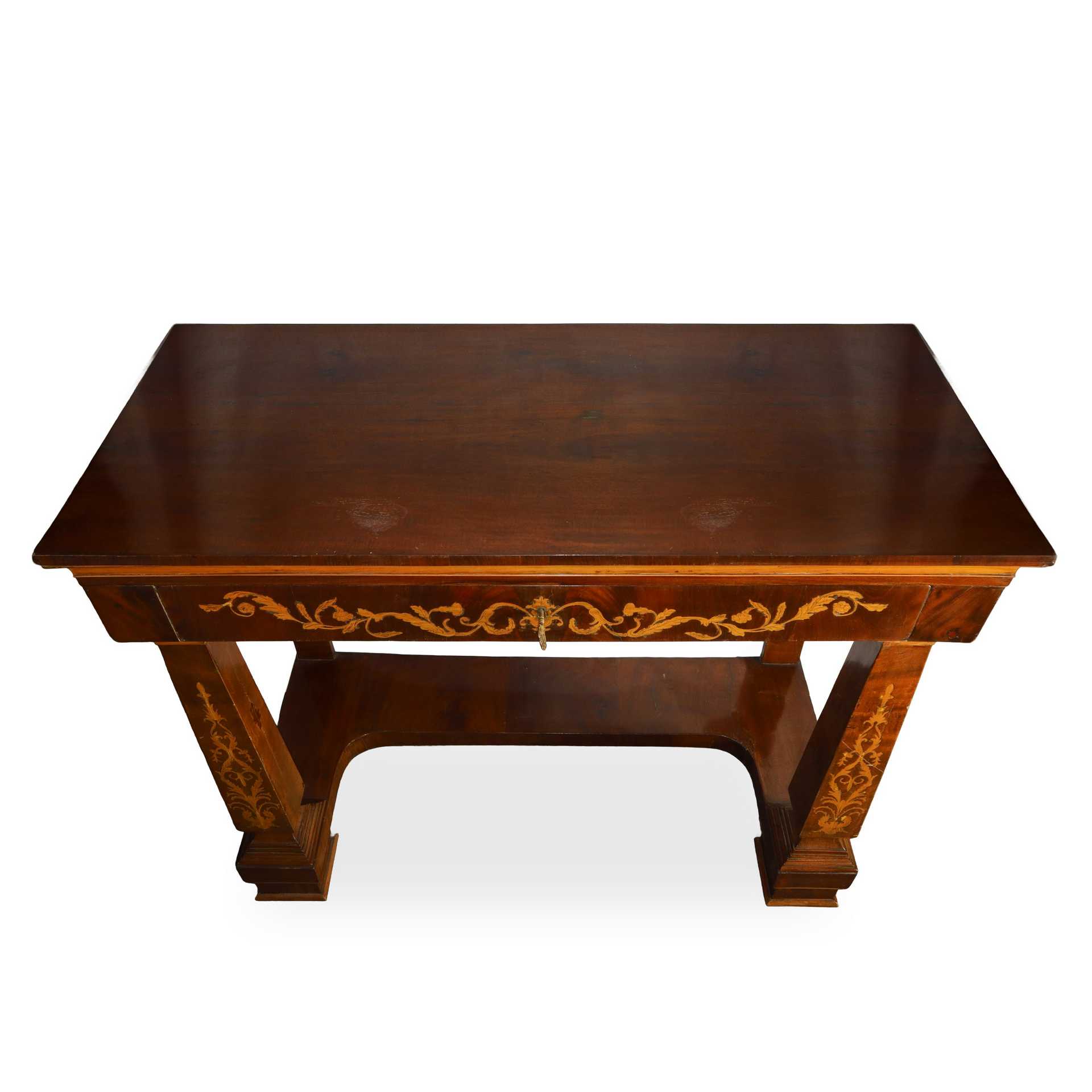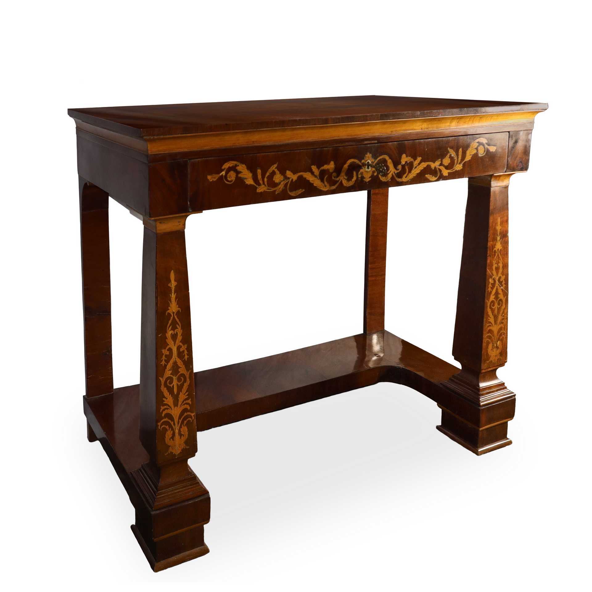 Consolle Carlo X in legno di piuma di mogano con intarsi in legni chiari, piedi a balaustra intarsiati, Sicily, first quarter of the 19° secolo
