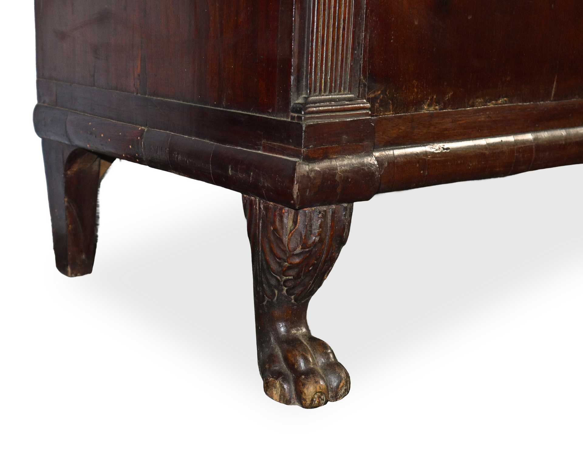 Chiffonier in piuma di mogano Impero, Sicily, primi 19° secolo Cappello intagliato e scolpito, 2 sportelli a scomparsa con all'interno 7 cassetti e specchio. Corpo basso con 5 cassetti e ai lati lesene con capitelli. Piedi felini