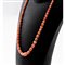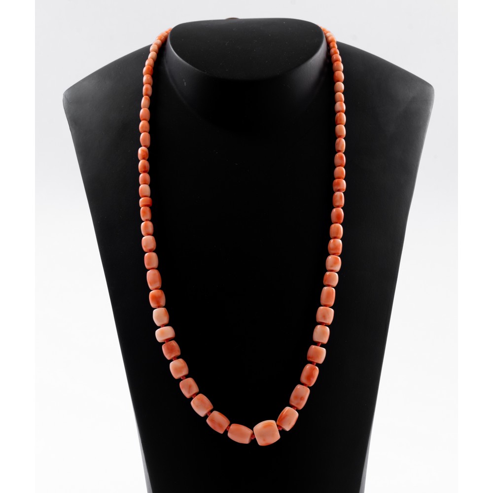 COLLANA in corallo rosa taglio barilotto a degradare, susta in argento dorato, coppette terminali in metallo dorato (g. 41,25).
