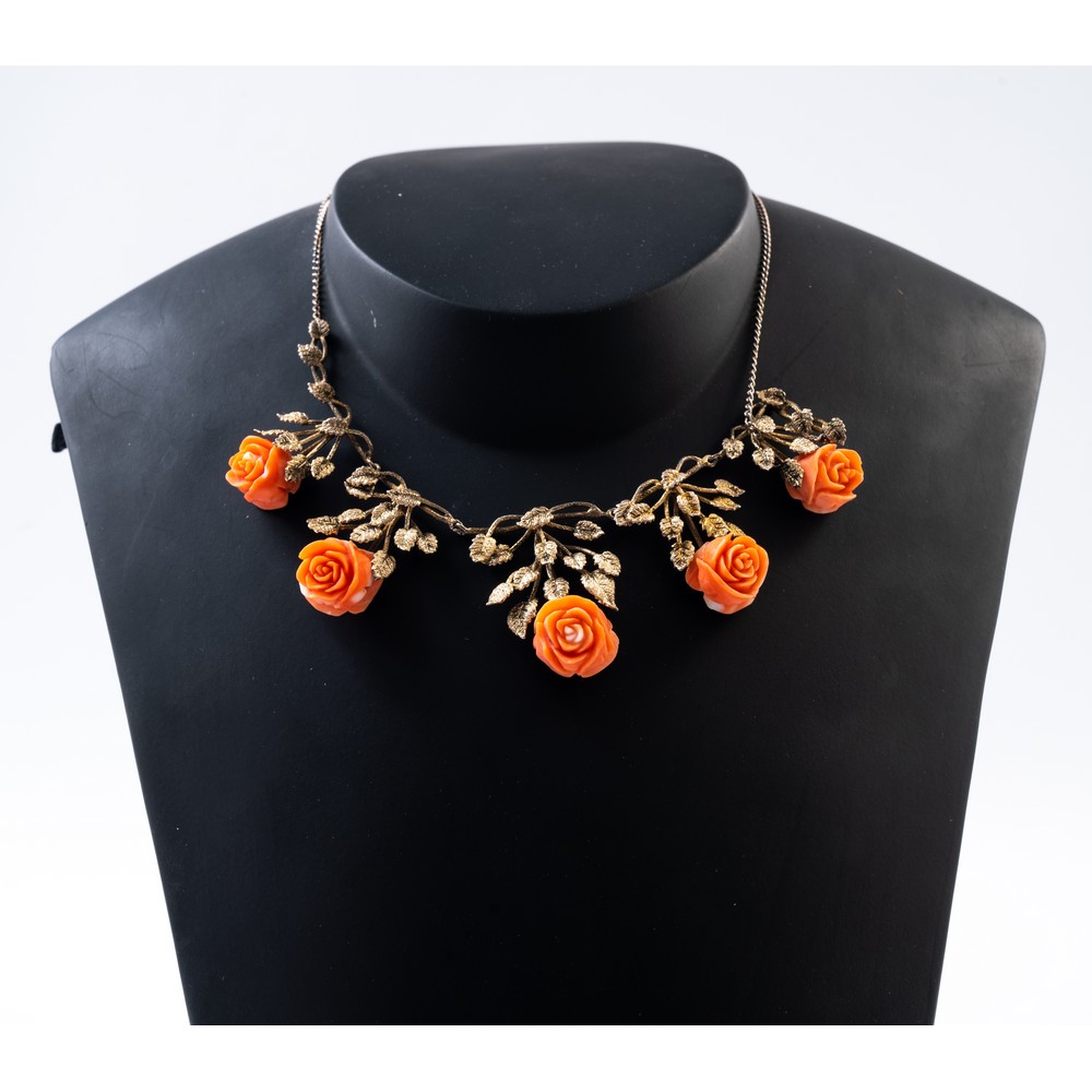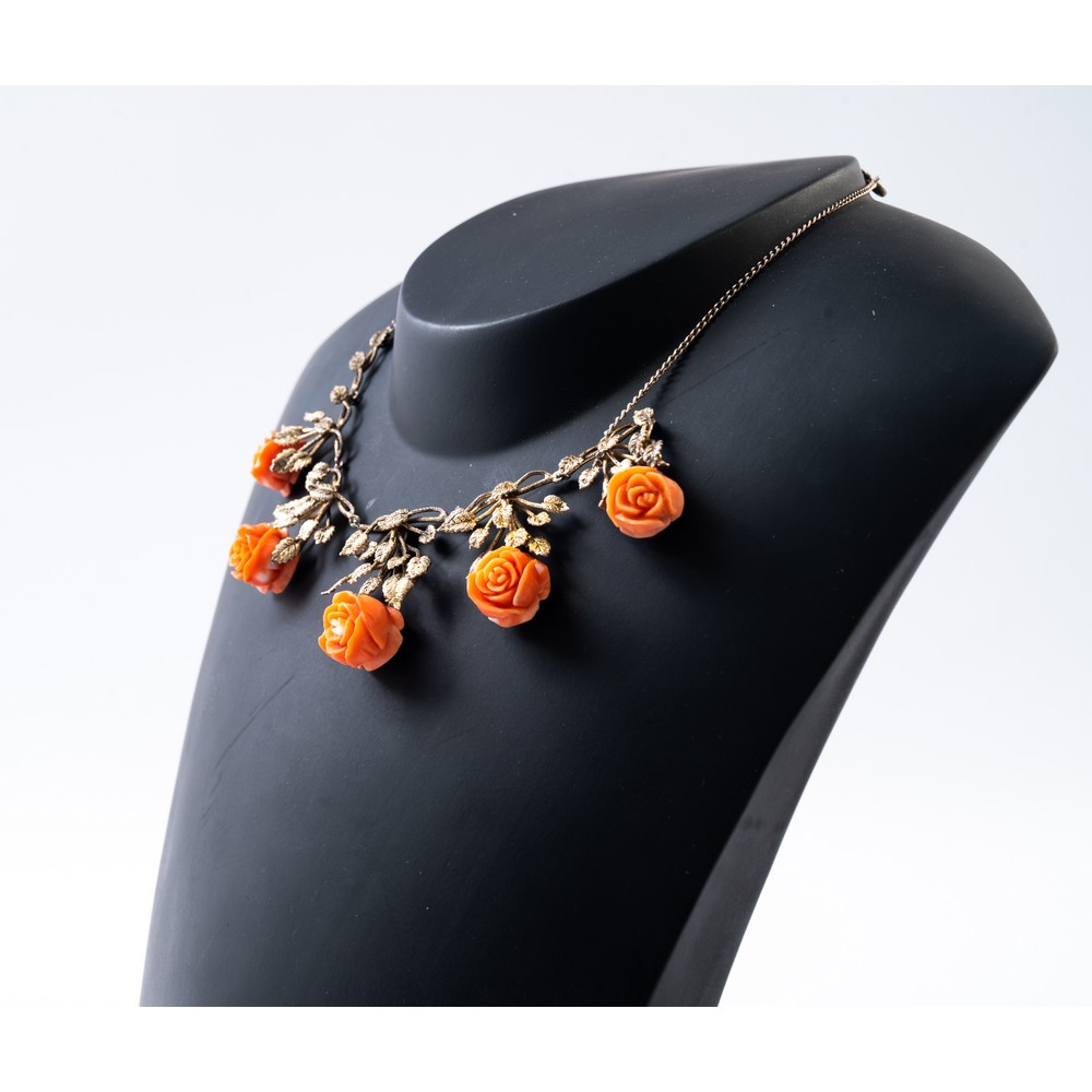 COLLANA in argento e argento dorato con rose in corallo (g. 25,55) (usure).