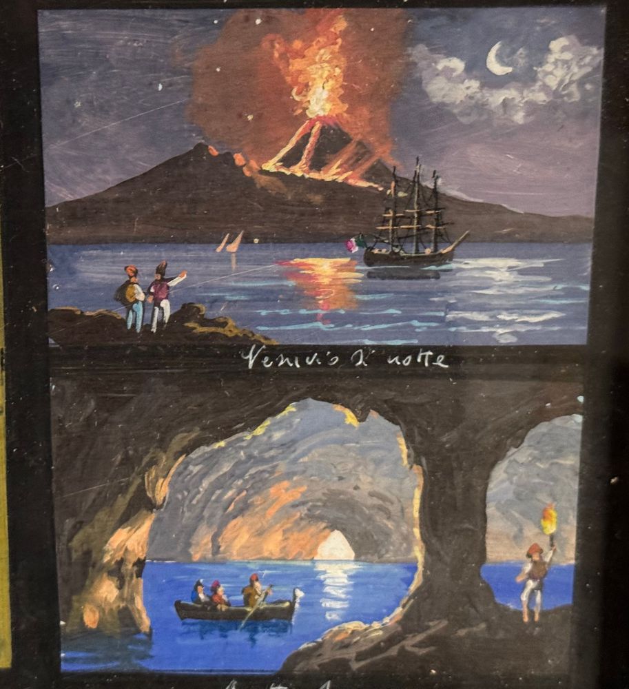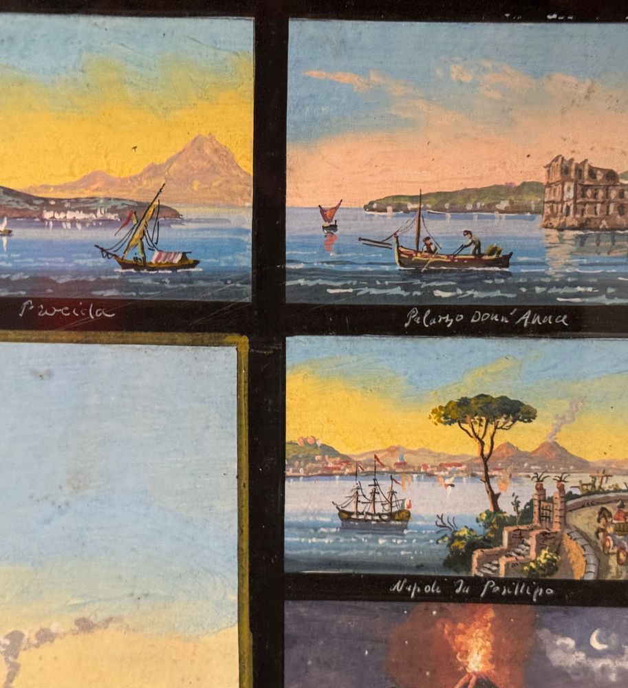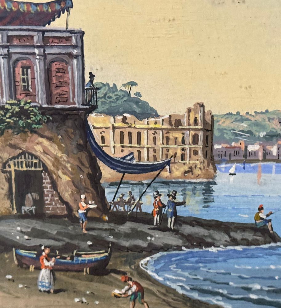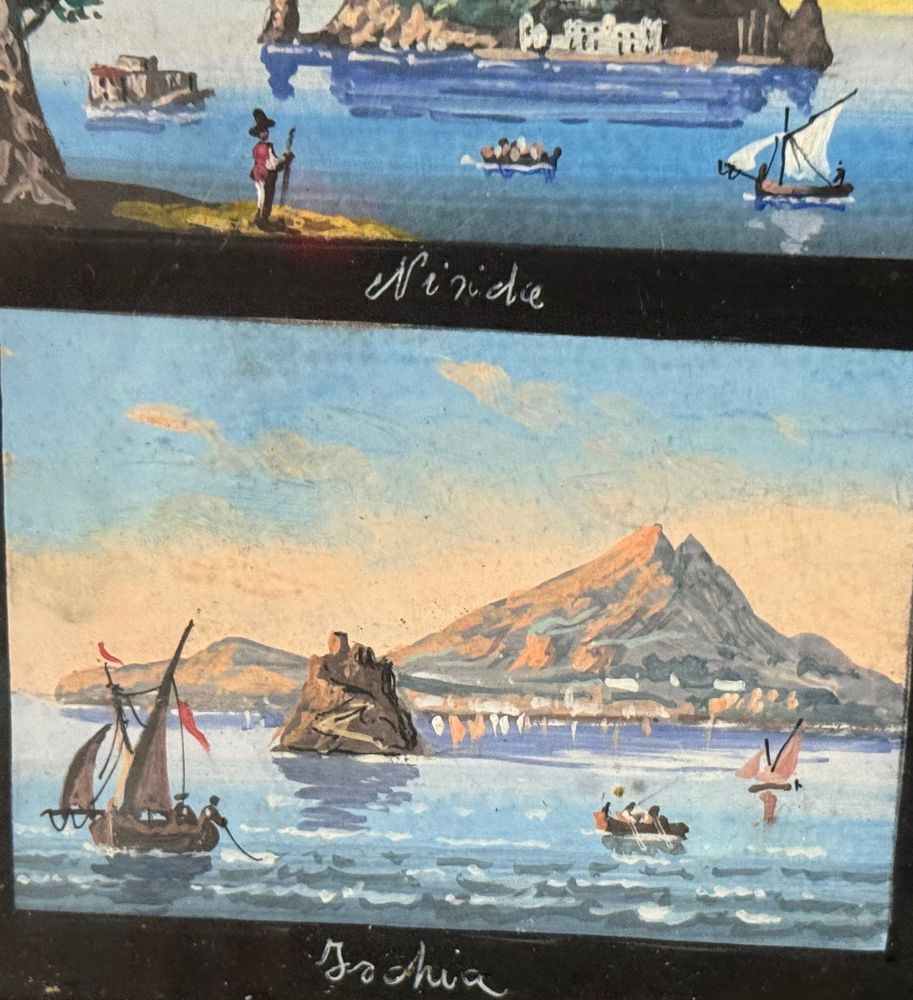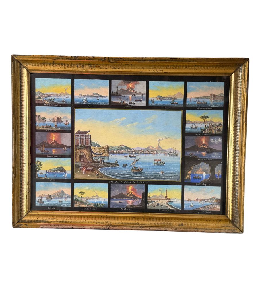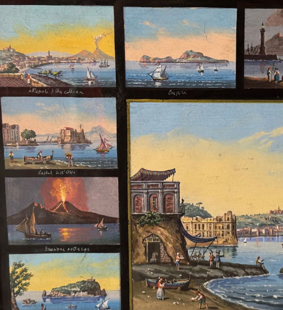 Dipinto guazzo (tempera su carta), periodo XX secolo scuola italiana, 17 dipinti raggruppati su un unico foglio raffiguranti luoghi partenopei. Dimensioni compreso cornice: 58x43 cm. Dimensioni interno cornice: 50x35 cm. Artista anonimo. Opera in buone condizioni con lievi segni di vissuto come da foto allegate.