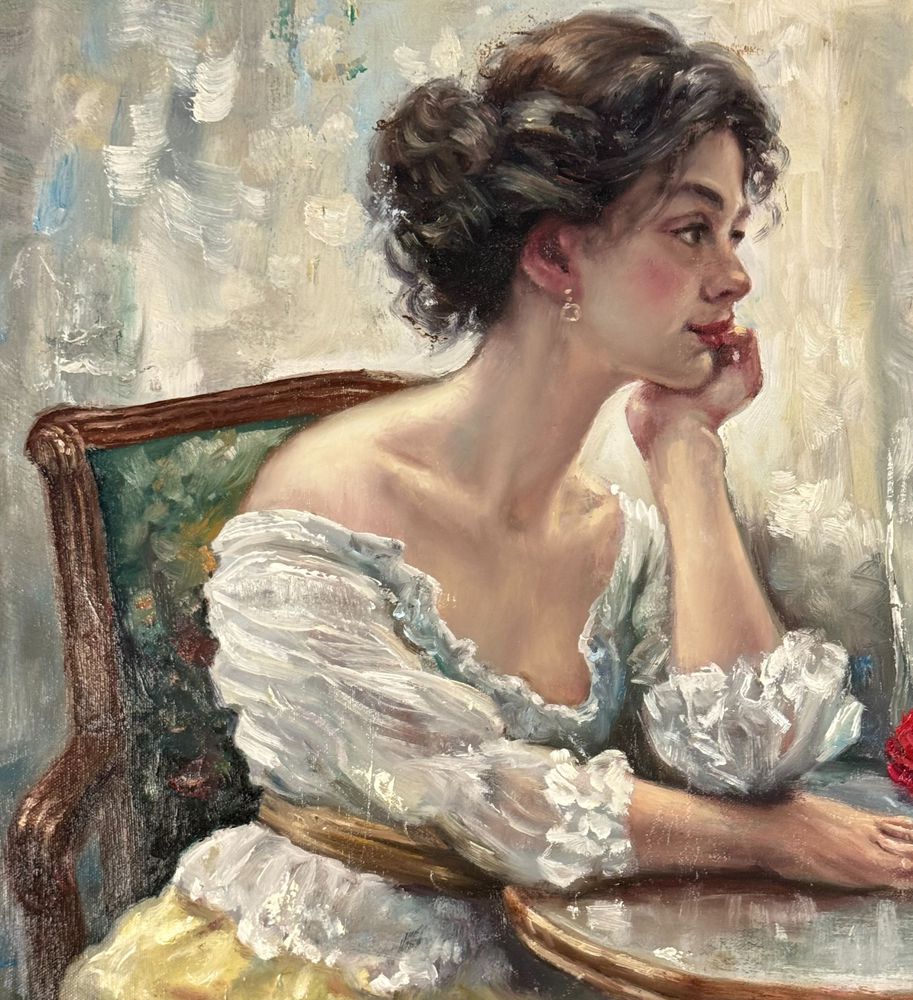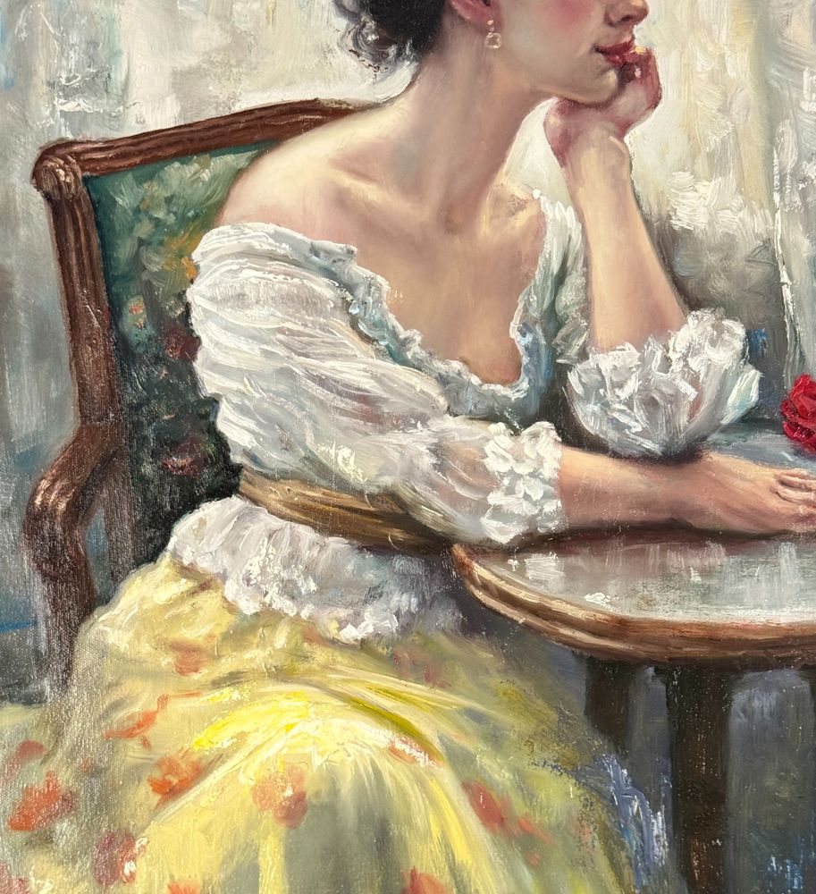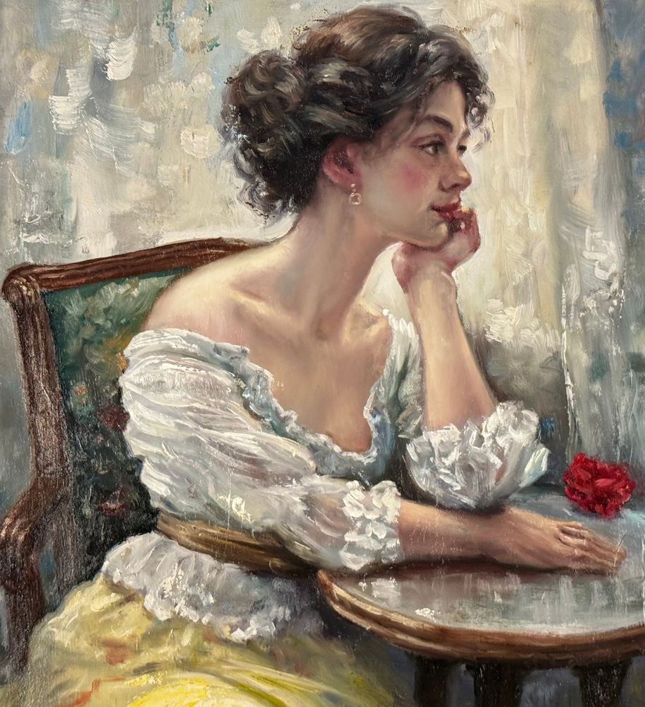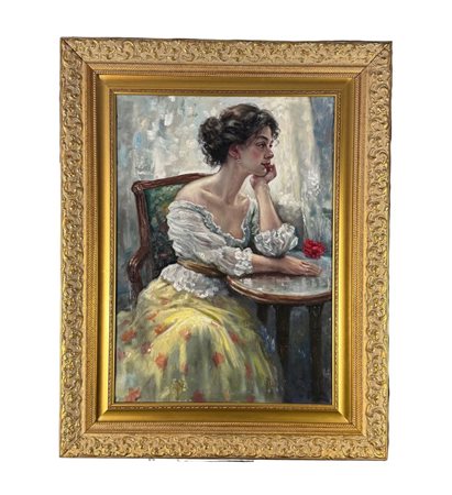 Dipinto olio su tela, periodo XX secolo scuola Italiana, raffigurante Ritratto di donna in un interno. Dimensioni compreso cornice: 73x93 cm. Dimensioni interno cornice: 50x70 cm. Da artista anonimo. Opera in ottime condizioni e di eccellente qualità artistica.
