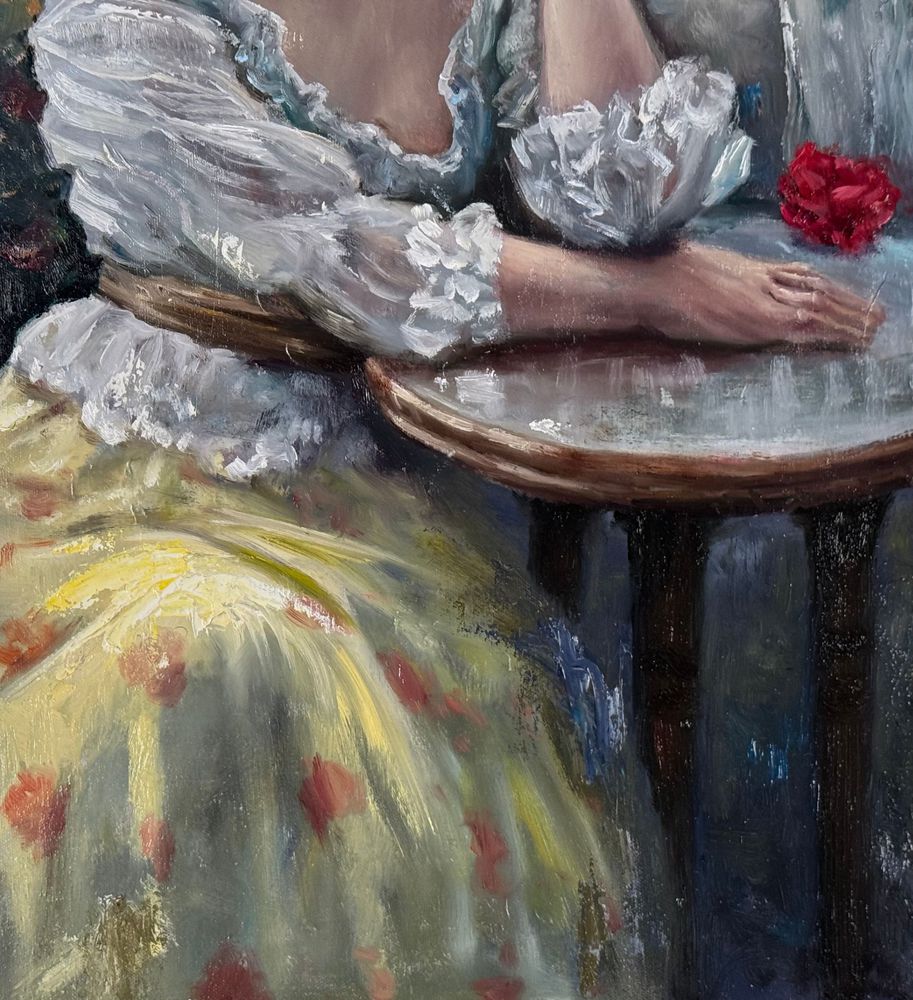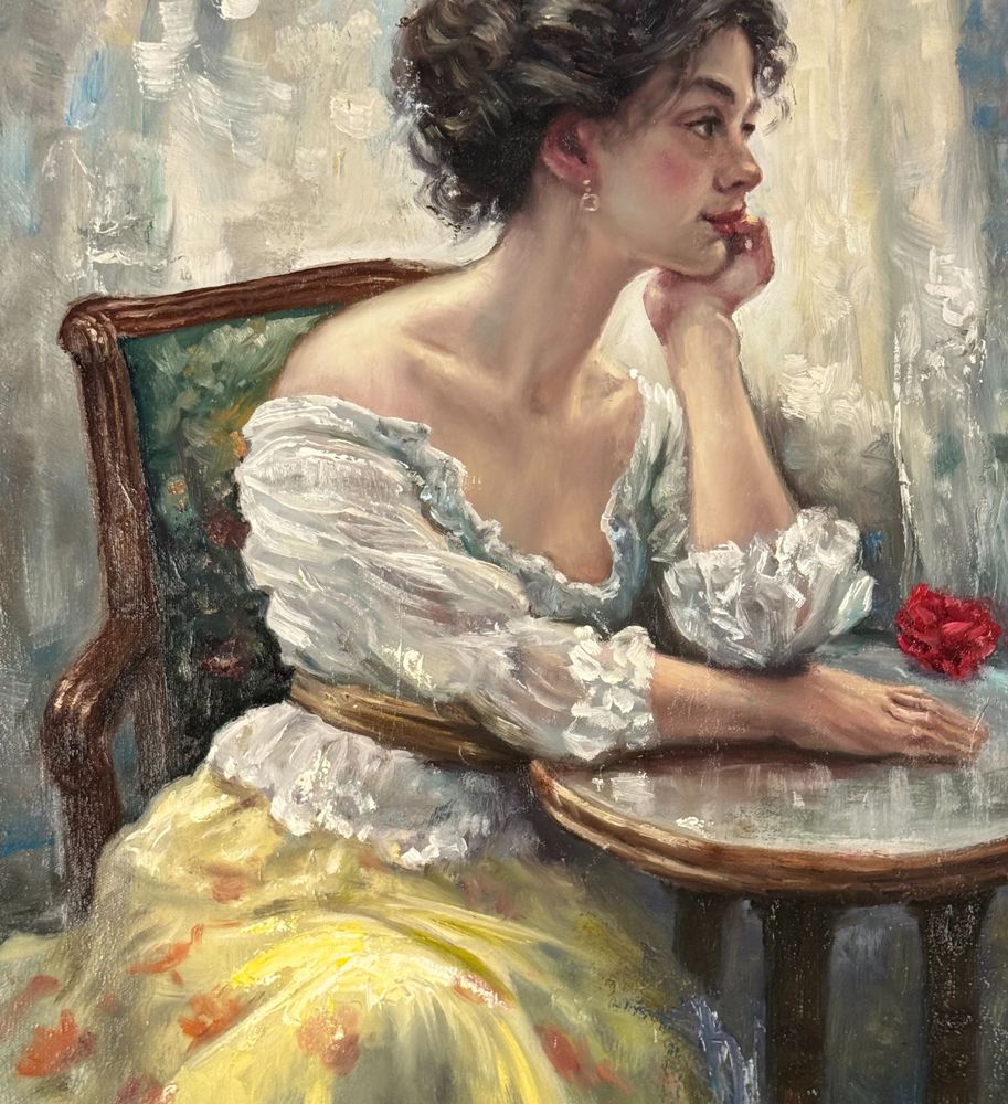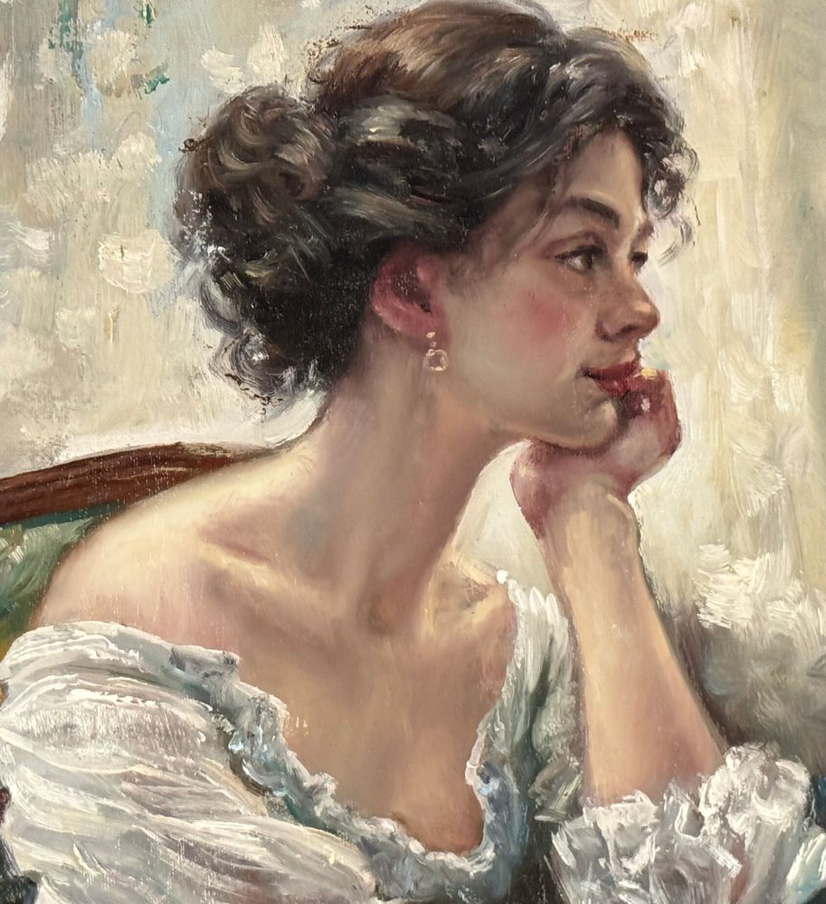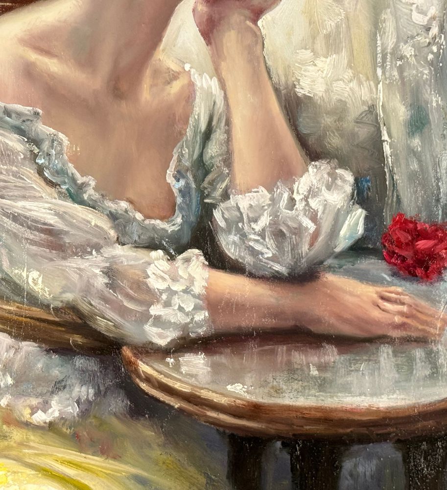 Dipinto olio su tela, periodo XX secolo scuola Italiana, raffigurante Ritratto di donna in un interno. Dimensioni compreso cornice: 73x93 cm. Dimensioni interno cornice: 50x70 cm. Da artista anonimo. Opera in ottime condizioni e di eccellente qualità artistica.