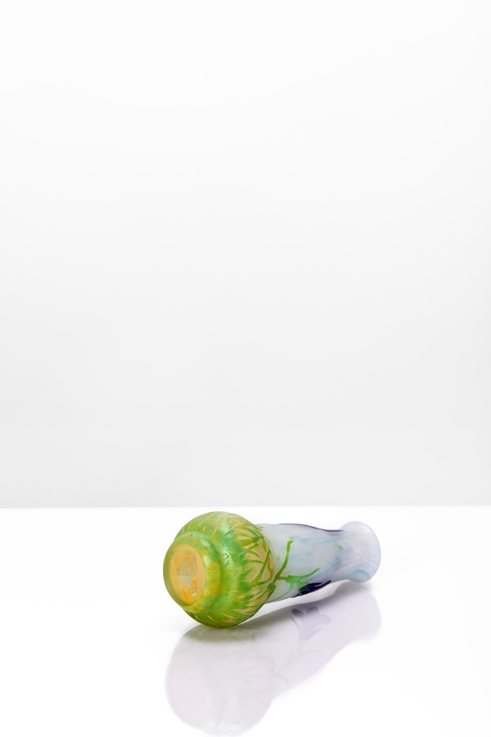 Vaso a bulbo rastremato verso l'alto inciso ad acido con decoro a germoglio e fiore di genziana