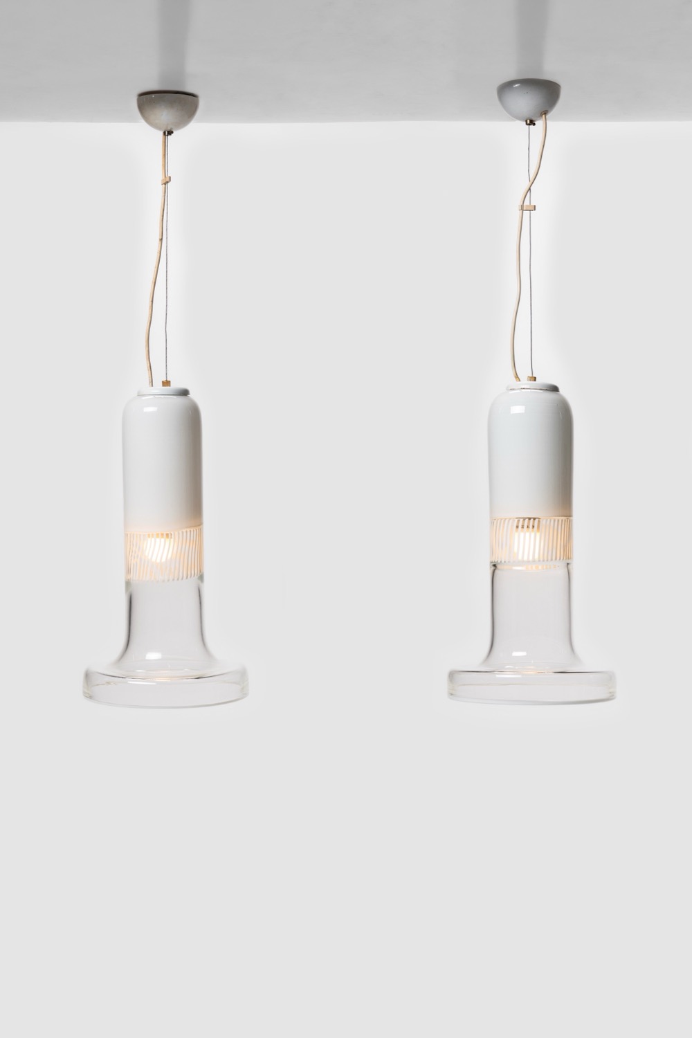 Coppia di lampade a sospensione modelloTokyo in vetro soffiato ad incalmo incolore e lattimo