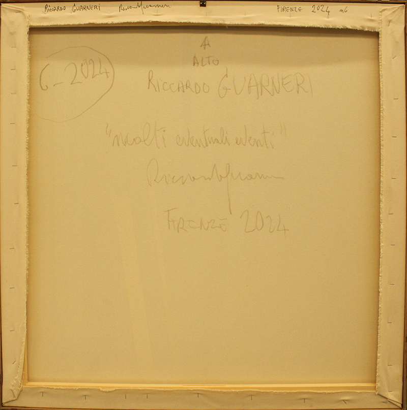 RICCARDO GUARNERI, "Molti eventuali eventi", 2024, tecnica mista su tela, 95x95 cm, 96x96x3 cm con cornice, peso 4 kg. Opera con autentica su foto dell'artista. Al fronte: firma in basso a destra. Al verso: firma in alto, titolo, firma, luogo e anno di esecuzione. Opera con certificato di provenienza della Galleria Daliano Ribani Arte. Opera con cornice