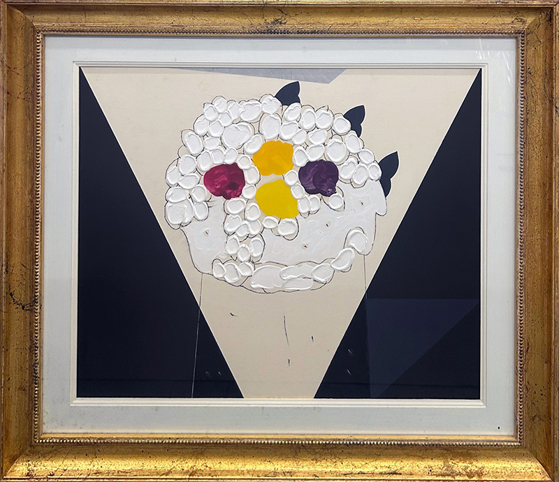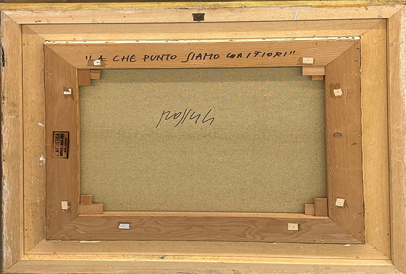 CONCETTO POZZATI, "A che punto siamo con i fiori", 1989, tecnica mista su carta intelata, cm 50x60, con cornice 70x80x5 cm, peso 5,50 kg. Al verso: firma l centro e titolo in alto. Opera con certificato di provenienza della Daliano Ribani Arte. Opera con cornice in omaggio. L'opera presenta leggera fioritura in alto a sinistra.