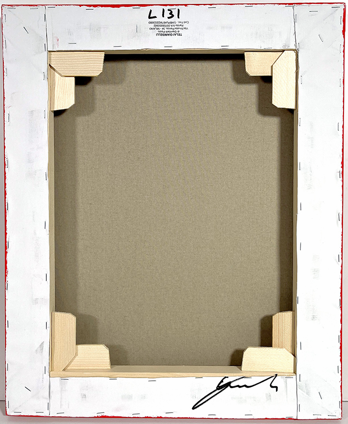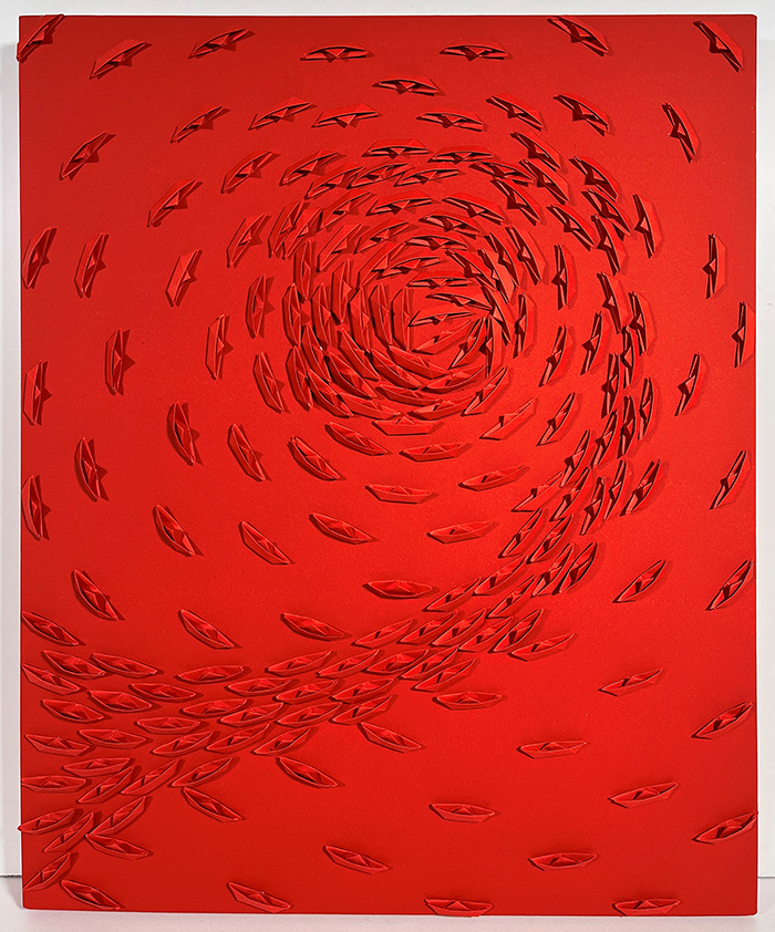 RICCARDO GUSMAROLI "Vortice Rosso" Anno 2025 barchette di carta su tela cm 55x45 Opera Registrata presso l'archivio dell'artista al numero 1131 Certificato di archiviazione e autenticità a cura dell'artista su fotografia
