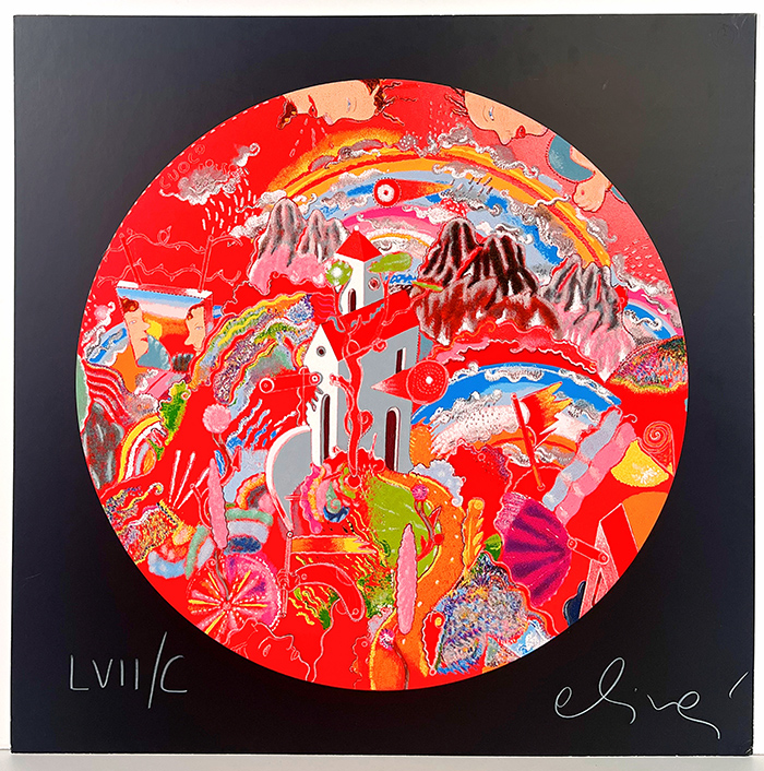ALINARI LUCA "Dentro l'omino di burro" Serigrafia polimaterica a 35 passaggi di colore su cartone Scholler cm 70x70 il cartone - diametro cm 57,5 il tondo Tiratura 200 numeri arabi, 100 numeri romani, 25 p.a. Opera numerata in basso a sinistra e firmata in basso a destra Certificato di autenticità a retro dell'opera