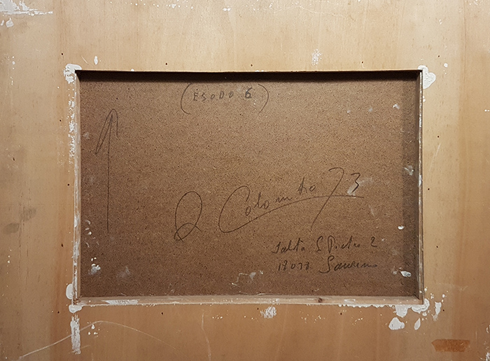 COLOMBO ROBERTO 1973 34x48 ESTROFLESSIONE SU TELA SU TAVOLA ESODO FRONTE 2