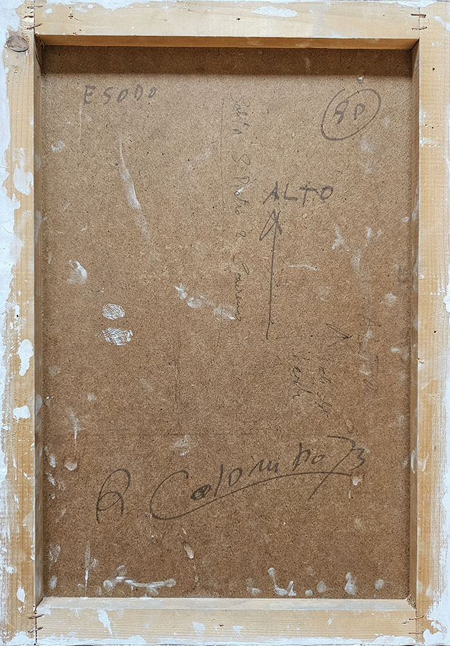 COLOMBO ROBERTO 1973 Esodo 1973 tecnica mista su tela 50x33 anno e firma al retro fronte 2