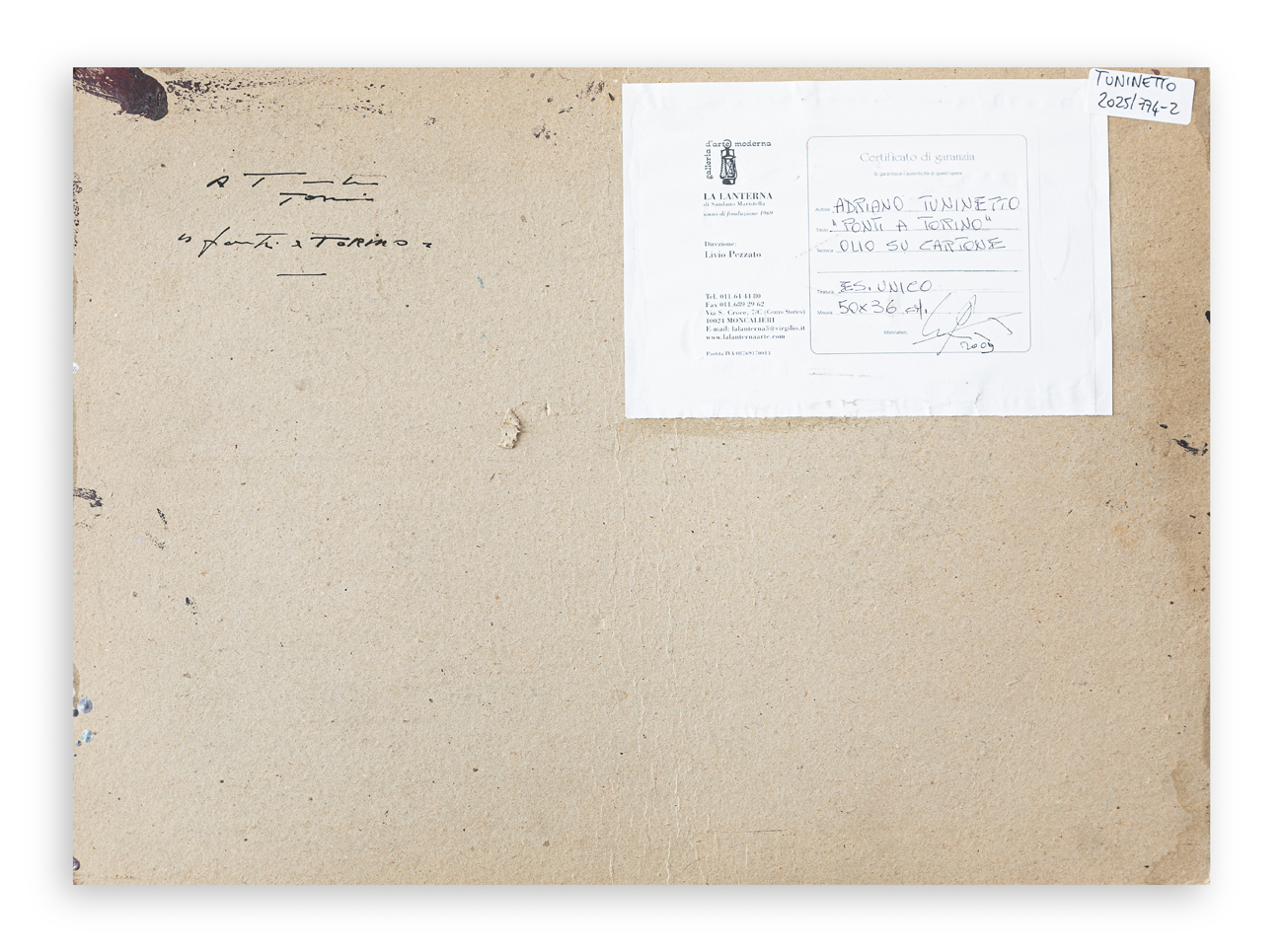 Certificato di garanzia a cura della Galleria La Lanterna (TO) al retro