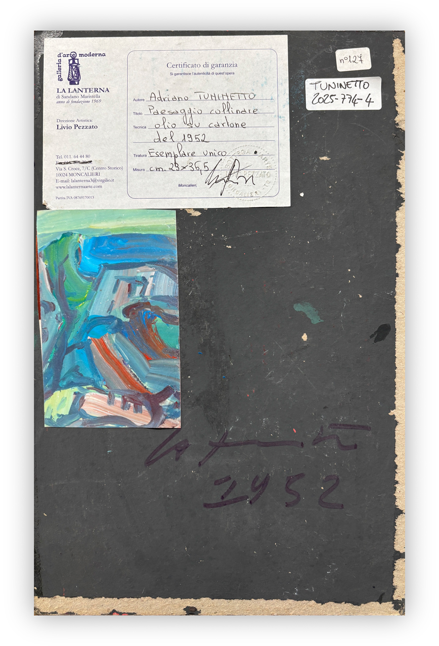 Certificato di garanzia a cura della Galleria La Lanterna (TO) al retro