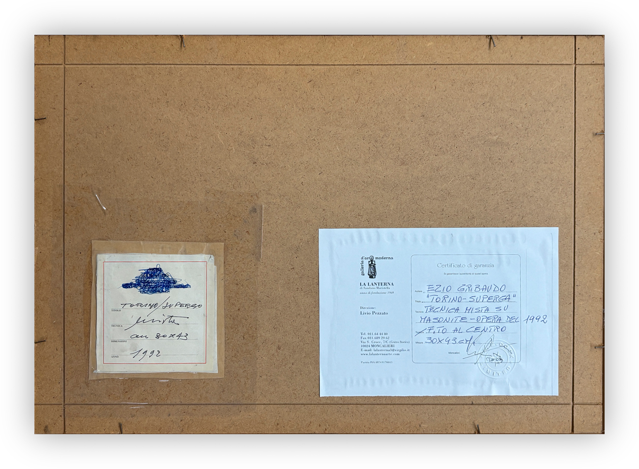 Certificato di garanzia a cura della Galleria La Lanterna (TO) al retro