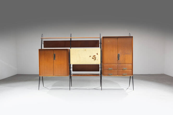Struttura in metallo verniciato, elementi in legno e particolari in ottone.