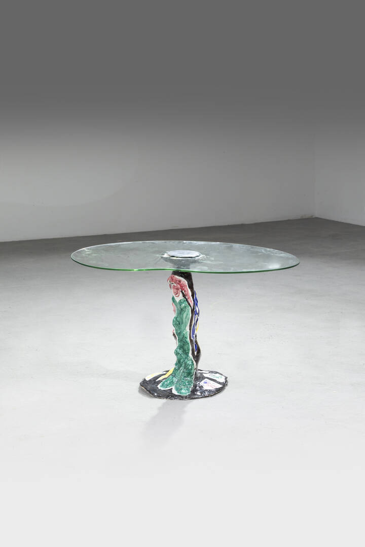 Struttura in ceramica smalta, piano in vetro e particolari in acciaio.