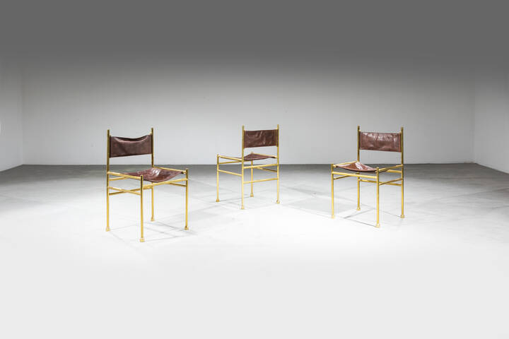 Struttura in ottone, sedute e schienali in cuoio.