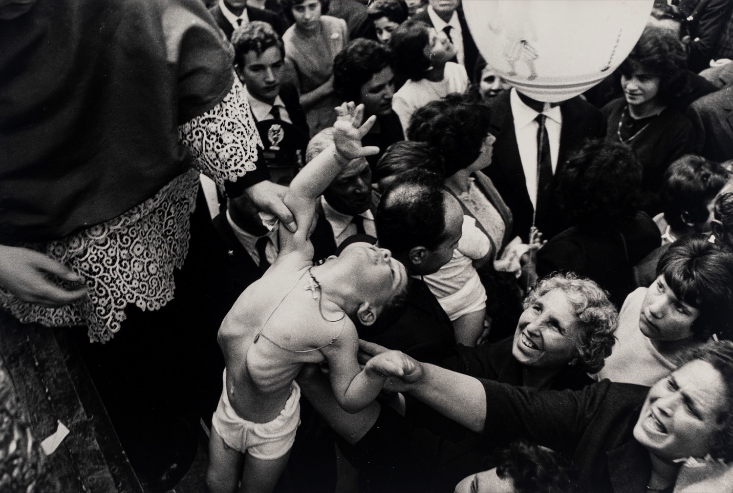 Un giovanissimo Ferdinando Scianna espone alla sua prima mostra fotografica che, viene a sapere, è apprezzata da un particolarissimo visitatore: Leonardo Sciascia. Prendendo il coraggio a quattro mani e attingendo alla sua già formata determinazione, il ragazzo contatta lo scrittore per il primo momento di quella che sarà una lunghissima storia di profonda amicizia. Ma per raccontarla bene si deve passare inevitabilmente dai libri e Feste religiose in Sicilia è quello giusto, scritto com’è con le parole dell’uno e le fotografie dell’altro, anche se quando uscirà a firmarlo come autore fu Sciascia mentre a Scianna fu riservato il sottotitolo. Questa fotografia tratta dalla serie lì pubblicata possiede l’immediatezza espressiva di quel lavoro che ancor oggi conserva una forza che sa di antico e tiene lontana la banalità del folclorismo di maniera.