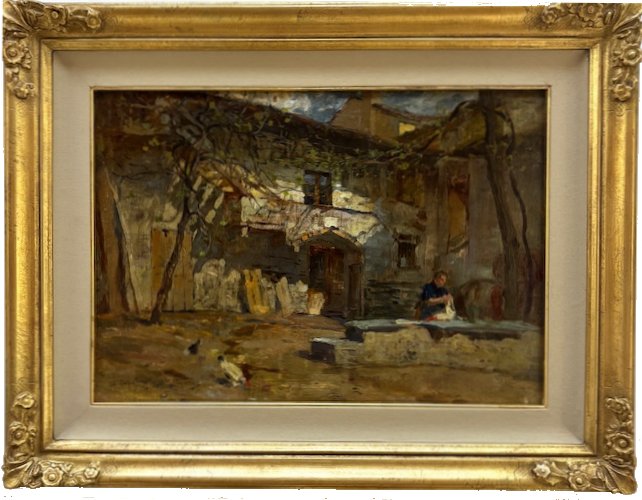 Riccardo Galli Milano 1869 - Barzio (LC) 1944 Lavando i panni Olio su cartone cm 35x51 firmato in basso a sx