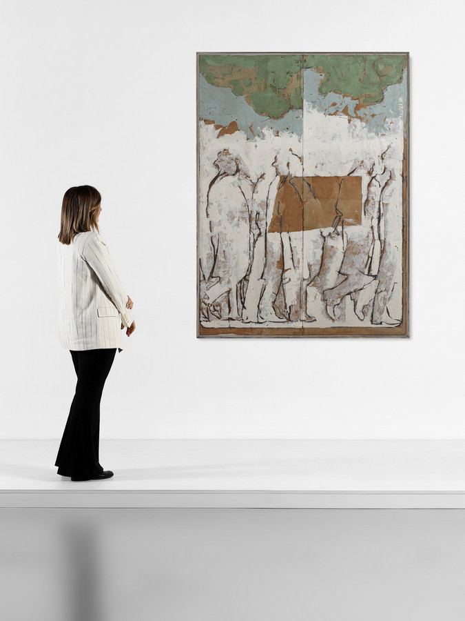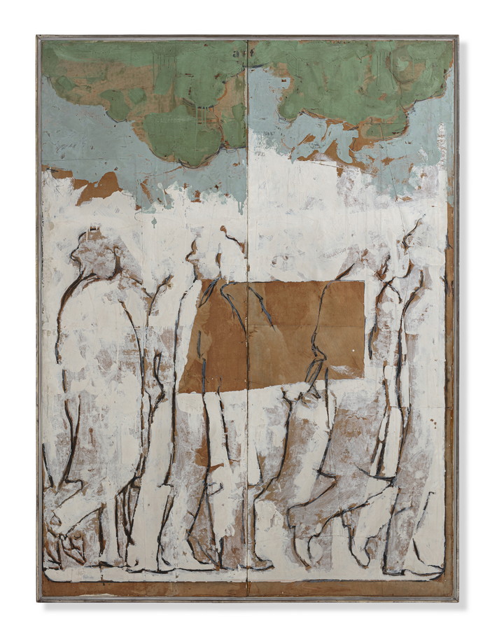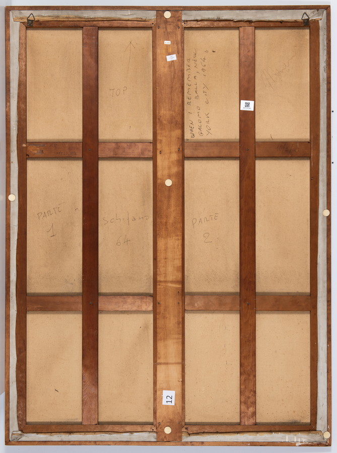 SCHIFANO MARIO (1934 - 1998) WHEN I REMEMBER GIACOMO BALLA, NEW YORK CITY (DITTICO). 1964. smalto, pastelli e carboncino su collage di carta da pacco applicato su tela. Cm 126,50 x 172,00. sul retro: titolo, firma e data