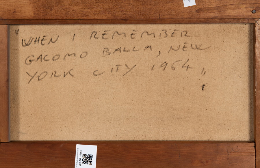 Nell'opera gemella per composizione e data "When I remember Giacomo Balla, New York City" qui presentata e già esposta presso la Galleria Odyssia e poi da Marconi, l'artista tocca gli stessi temi attingendo alla propria esperienza americana in un doppio registro: la folla di New york e il linguaggio di Balla.