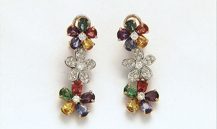 COPPIA DI ORECCHINI PENDENTI. In oro rosa e bianco 18 kt perno e clip, montatura a tre fiori incernierati disposti in verticale decorati da zaffiri multicolor per tot. cts. 9,70 ca. e diamanti taglio brillante per tot. cts. 0,65 ca.