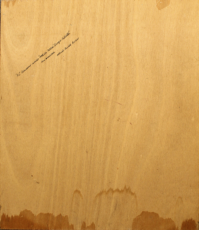 NANDO CRUDELI BISTURI, "Uomo", anni '80, olio su tavola, cm 60x50x1, peso 1. Al fronte: firma in basso a destra. Al verso: dedica in alto a sinistra. Opera senza cornice.