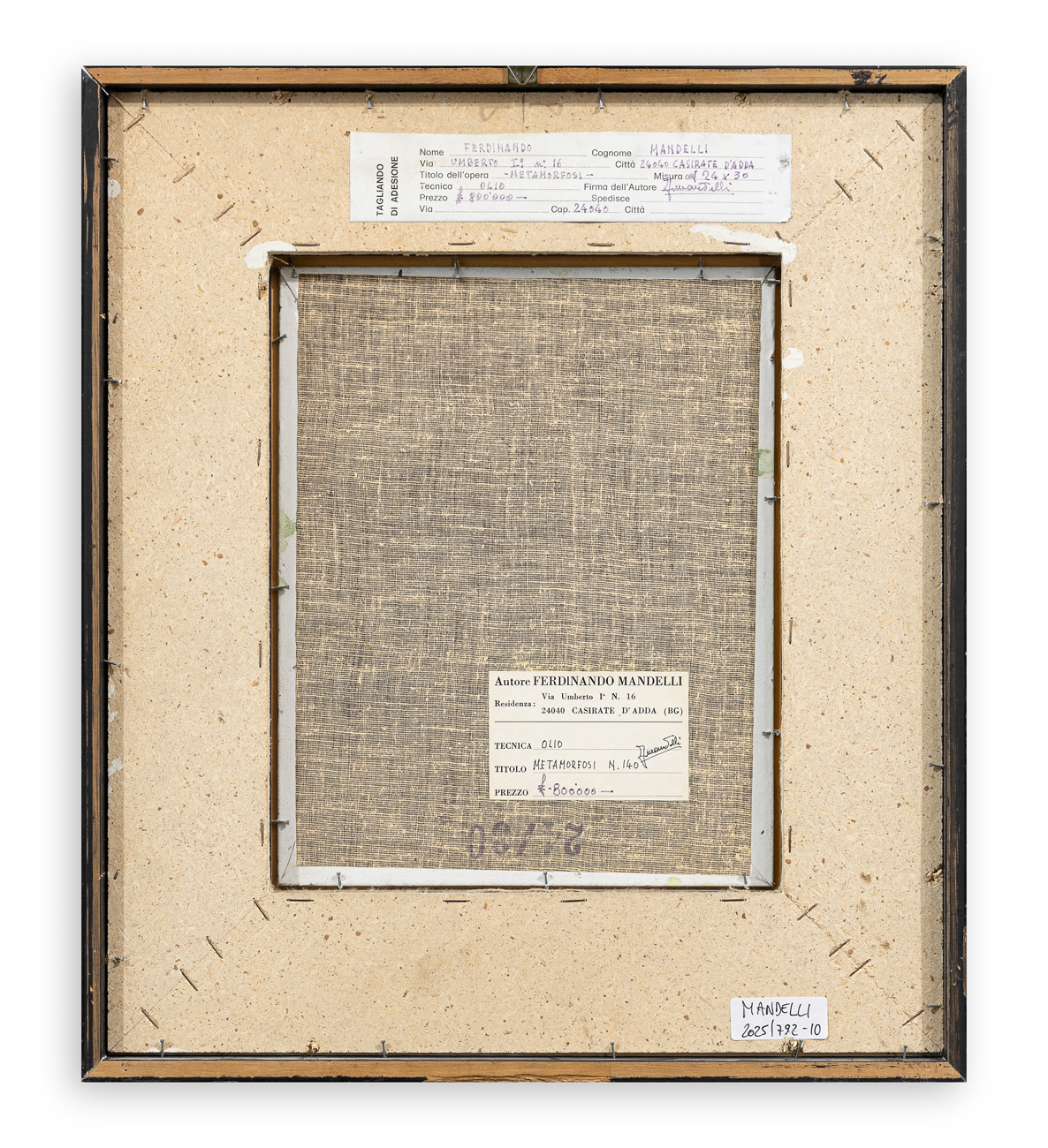 Etichetta dell'Artista recante firma, titolo e tecnica al retro