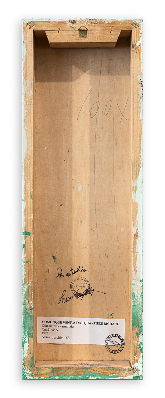 Cartiglio recante numero di archiviazione, firma, dichiarazione di autenticità e timbri dell'Artista al retro