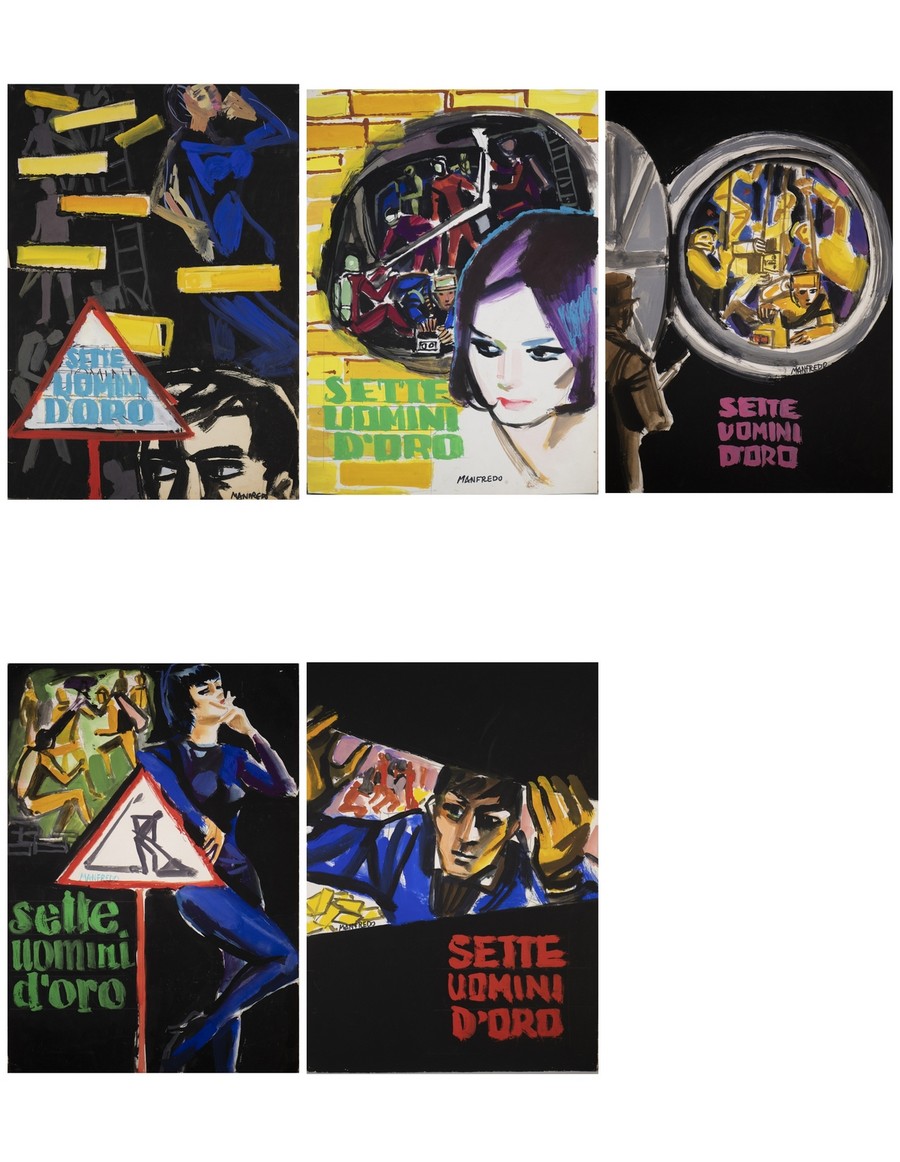 Acerbo Manfredo (1913 - 1989) 5 Bozzetti originali per il Film di azione e poliziesco "7 Uomini d'oro" di Marco Vicario con Rossana Podestà, Philippe Leroy, Gastone Moschin. 1965. Tempera su cartoncino. Cm 35,00 x 50,00. I cinque bozzetti sono tutti firmati .